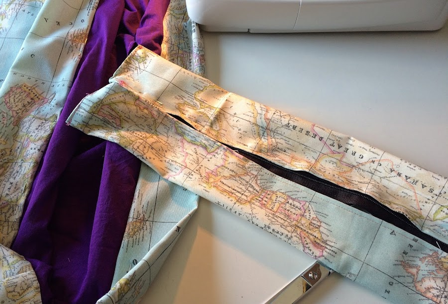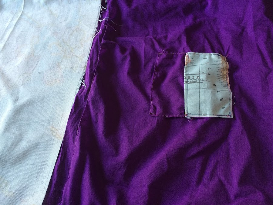 El proceso es sencillo, solamente uní las piezas de la tela mapa mundi, por un lado y por otro las del forro, donde además puse unos bolsillo, que luego siempre son muy útiles, para las cosas pequeñas, como el móvil.