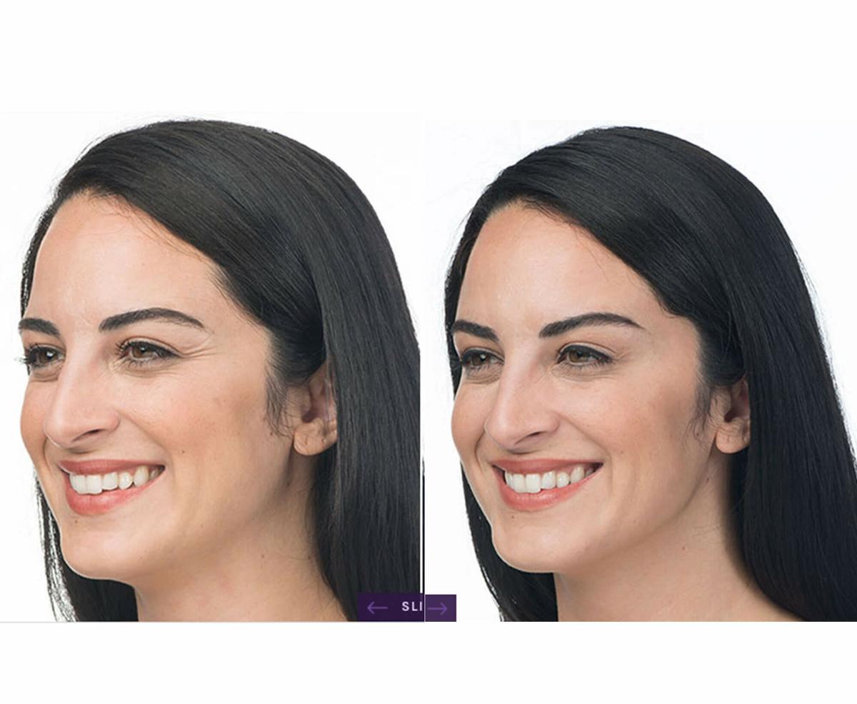 Cómo puedes observar, al fruncir el ceño, en la parte izquierda, se producen arrugas de expresión. Son más habituales de lo que crees, ya que las hacemos de forma involuntaria, y hay personas, que parecen siempre enfadadas. En la parte derecha puedes observar que la mayoria de las arrugas desaparezacan.