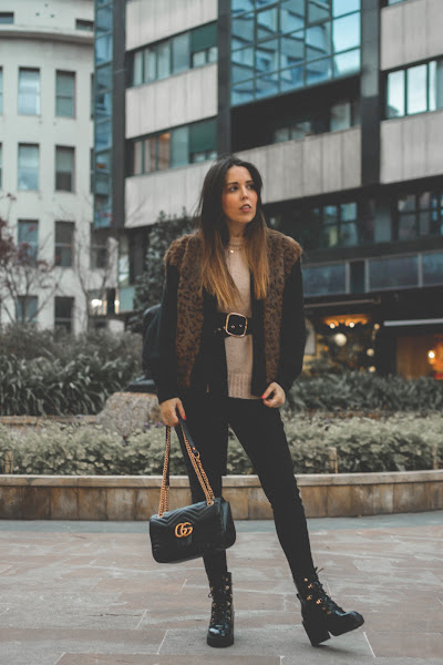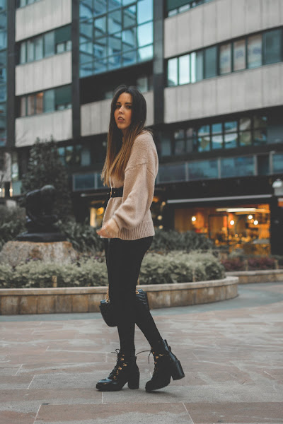 He querido hacer un look bastante básico, por lo que lo combiné con unos track leggings en color negro. La banda lateral es también del mismo color en cuero, quizás tenéis que fijaros mucho en las fotos debido a la edición del color al estar cayendo la noche. No soy mucho de leggings porque siempre me veo demasiado apretada para llevarlos con algo corto, siempre que los llevo, los combino con prendas como la de hoy. Me los compré en un viaje hace poquito y desde entonces, les he dado bastante uso. Para darle un toque actual al look, el cinturón ciñendo la cintura en color negro con detalles dorados, a juego con los botines y también el bolso. Como iba a tardar en llegar a casa, decidí incluir una preciosa chaqueta que rescaté del armario de mi mami, es como un tesoro.