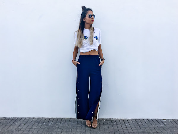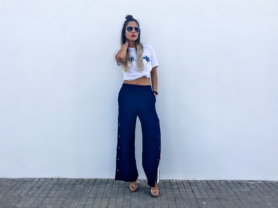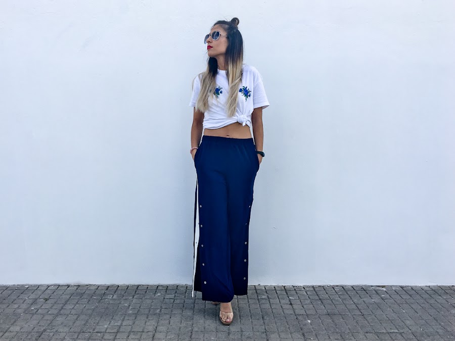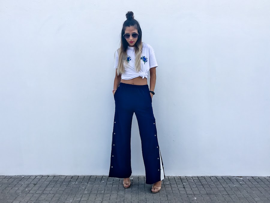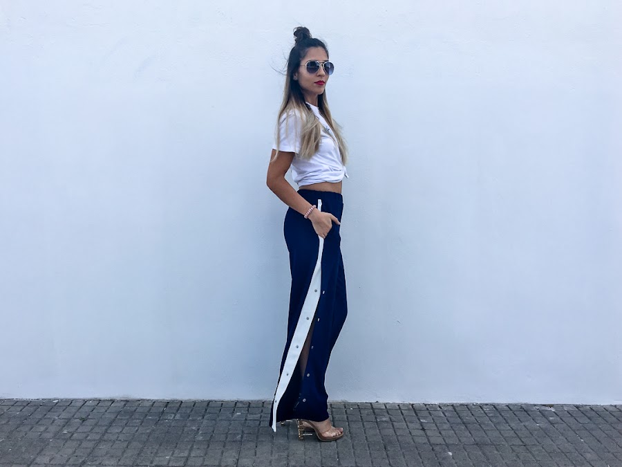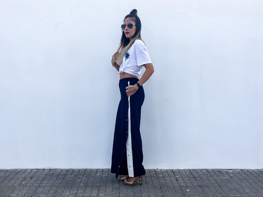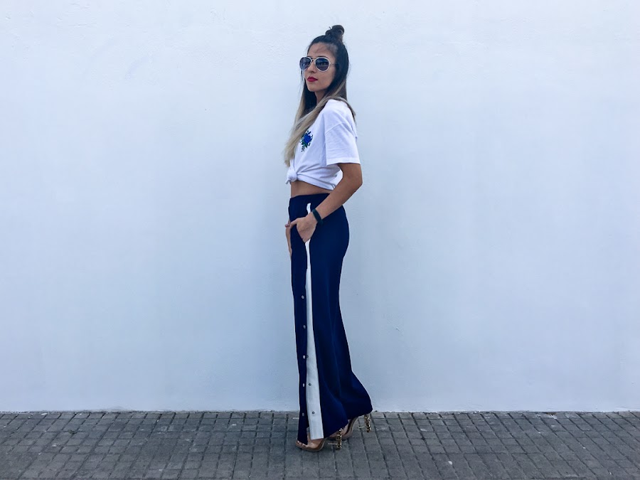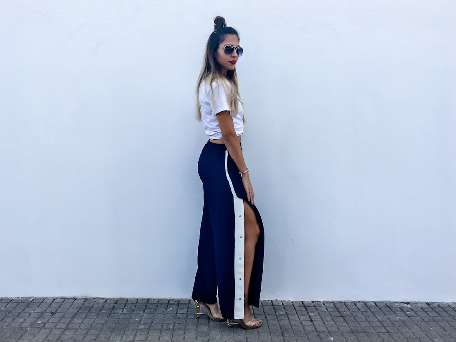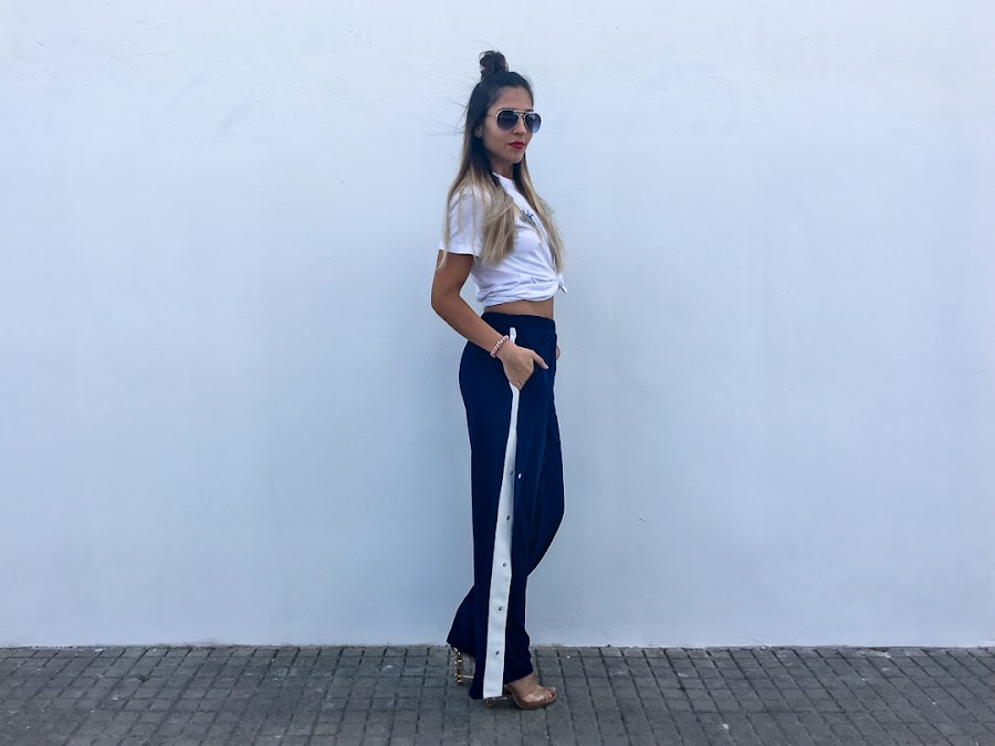 Y el look que os enseño hoy se resume en dos palabras: Chandal + tacones. Si si, algunos os reís y más de una vez lo hemos usado como objeto de burla (yo incluida), pero en el mundo de la moda, todo vale. Se llaman Track Pants y son los típicos pantalones de chandal que usabas hace más una década, con broches y rayas laterales. Pero esta vez, vienen reinventados y además, no solo se usan con deportivas, sino con tacones y os aseguro que quedan genial. De hecho, para el look de hoy, probé varias alternativas y al final, me quedé con los tacones.