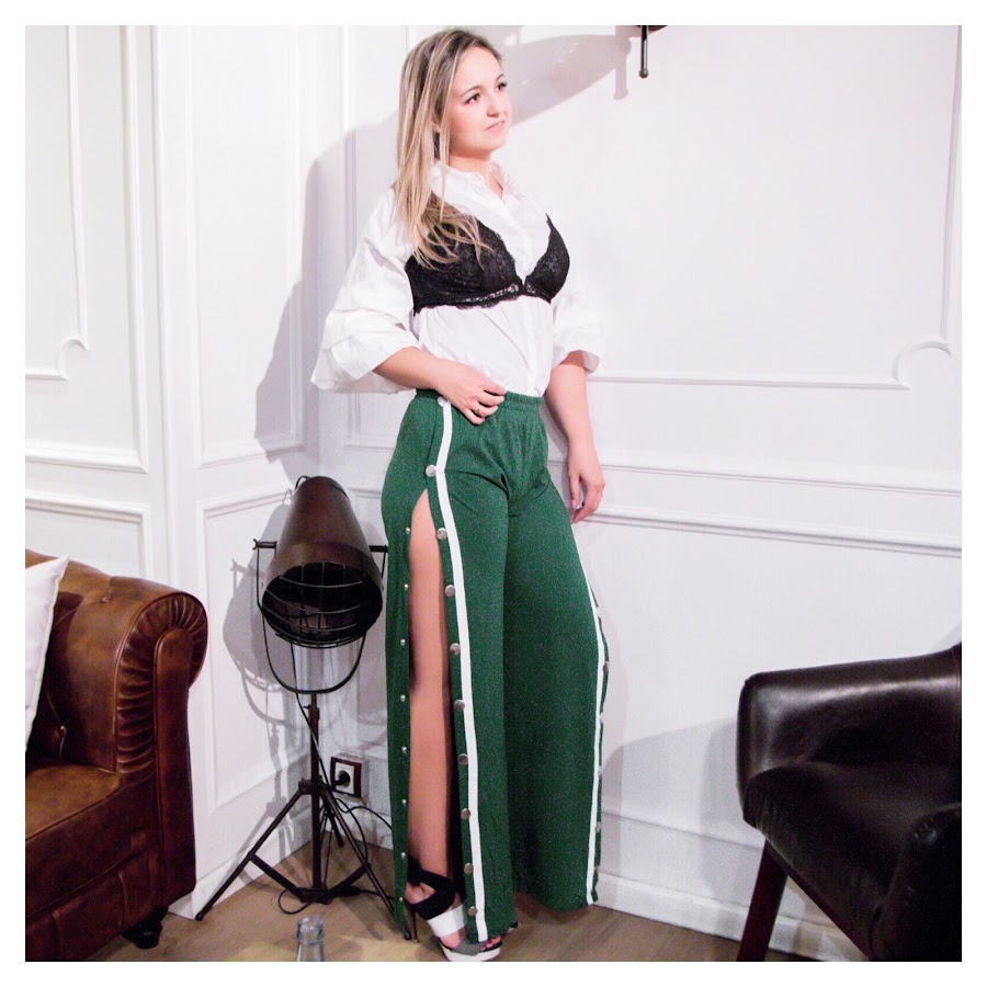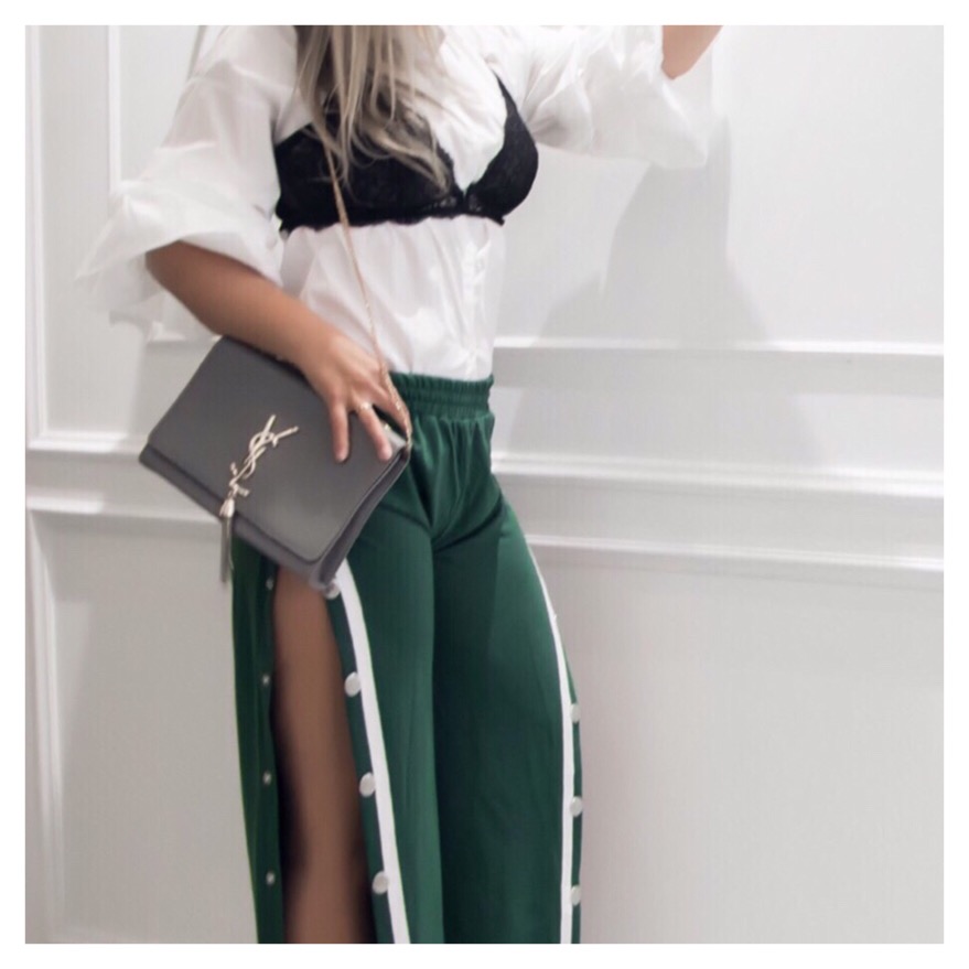 Os explico con más detalles el look: He elegido el pantalón verde porque me ha parecido que estaba menos visto que en otros tonos y, además, es un color que me gusta un montón. Lo he mezclado con una camisa de popelín con volantes en las mangas de Zara y un bralette de Oysho. Las sandalias en blanco, negro y gris son de Zara y el bolso de Yves Saint Laurent, también gris.