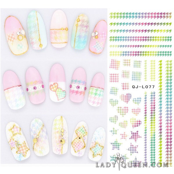 Volvemos con una decoración basada en decals o transfers para uñas, en este caso un diseño multicolor de "houndstooth" o pie de poule. Por si no conocen de que va esto de los decals, transfers o tatuajes para uñas como también se los conoce son láminas de plástico sumamente finas sobre las que viene preimpreso un diseño. Se llaman "tatuajes de agua" porque se utiliza agua para desprender el diseño del papel en que viene para luego aplicar sobre las uñas. Algunos al ser transparentes necesitan un color claro (o blanco) de base en la uña para que se pueda ver el diseño como en este caso. En cuanto a duración tienen la misma que el esmalte que tengan aplicado, al aplicar topcoat o brillo protector el decal se "funde" con el brillo y el esmalte sin posibilidad que se despegue luego como un sticker o pegatina.
