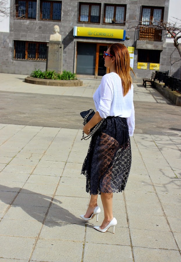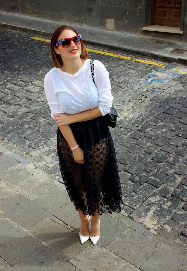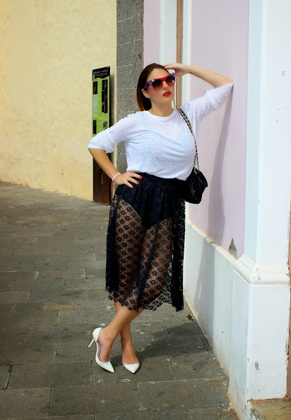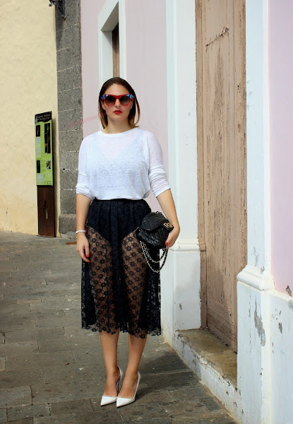 Las transparencias no son aptas para tímidas y esta temporada bajan de las pasarelas para pasearse por las calles. La clave para lograr un look femenino ? elegante y no caer en lo vulgar está en elegir la ropa interior adecuada, en mi caso la falda de encaje pedía una lencería lisa por eso escogí un bodi liso del mismo color que la trasparencia estilo años 50.