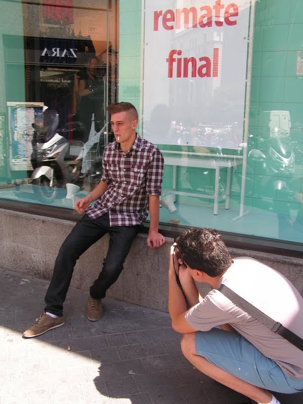 Quedamos en Gran Vía ¡qué calor! ya está empezando a ser duro esto, y me encuentro con Roberto de lo que imagino al verle son las bases de este trabajo: ropa y calzado cómodo (yo lo incumplía con mis tacones), su cámara y lo que al final se deduce del seguimiento....mucha cara dura ó mucho morro, como queráis llamarlo, esto es imprescindible ya que sino lo de acercarse a un desconocido o desconocida para pedirle una foto y sentir vergüenza por ello...mejor quédate en casa.