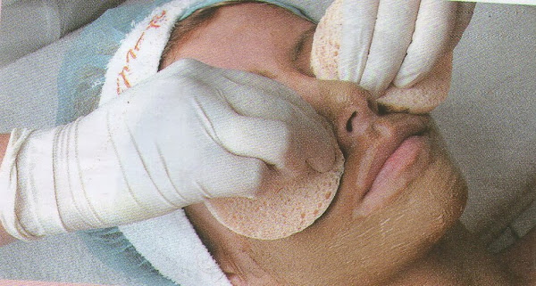 13-Limpiar la mascarilla con esponjas faciales húmedas, luego secar el rostro con papel colocando sobre el papel tisú.