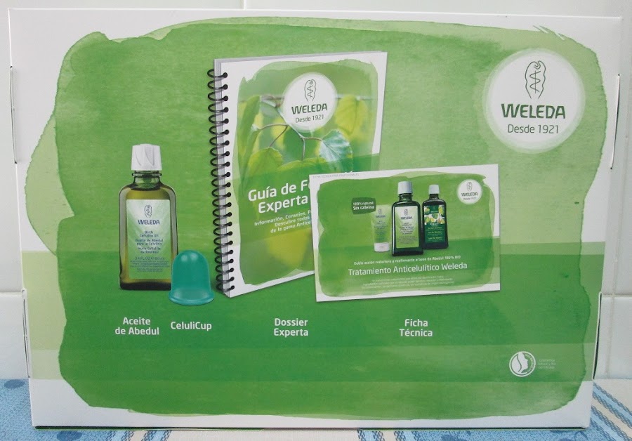 Dentro de la caja me encontré con: un dossier donde explica las características e información de ambos productos, así como consejos, trucos, hábitos alimenticios, recetas de zumos y cócteles bio, ejercicios sencillos, etc; también, el aceite anticelulítico de "Weleda" y un "CeluliCup" (que tenía mucha curiosidad de probar una tipo como la "CelluBlue"). Pero además, incluyeron como detalle, una crema de manos, de su propia gama.