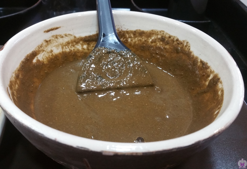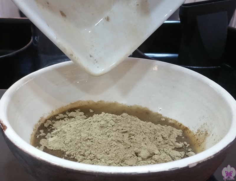 Al mezclar el micronizado de las 14 plantas con el agua caliente conseguimos esta pasta similar en olor y textura a un barro, el cual me aplicaron como si fuera un tinte, separando en líneas el cabello y poniendo el producto en la raíz. Una vez todas las raíces estaban cubiertas se repartió el resto del producto por todo el cabello, dejándolo todo impregnado de las hierbas.