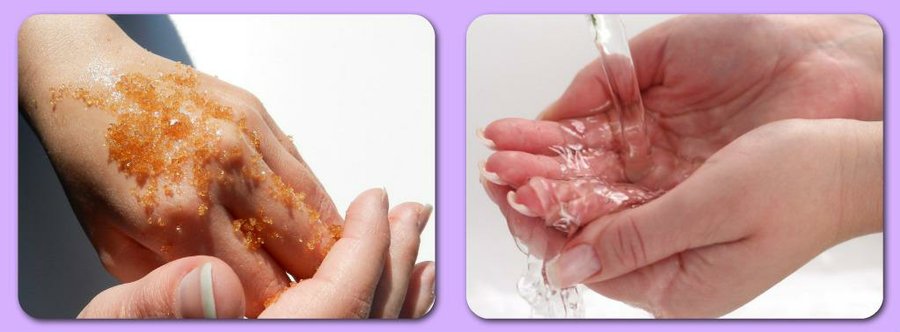 -Colócate una porción del exfoliante y espárcela en toda la mano, no olvides colocarla entre tus dedos