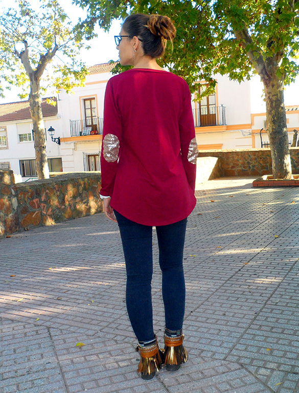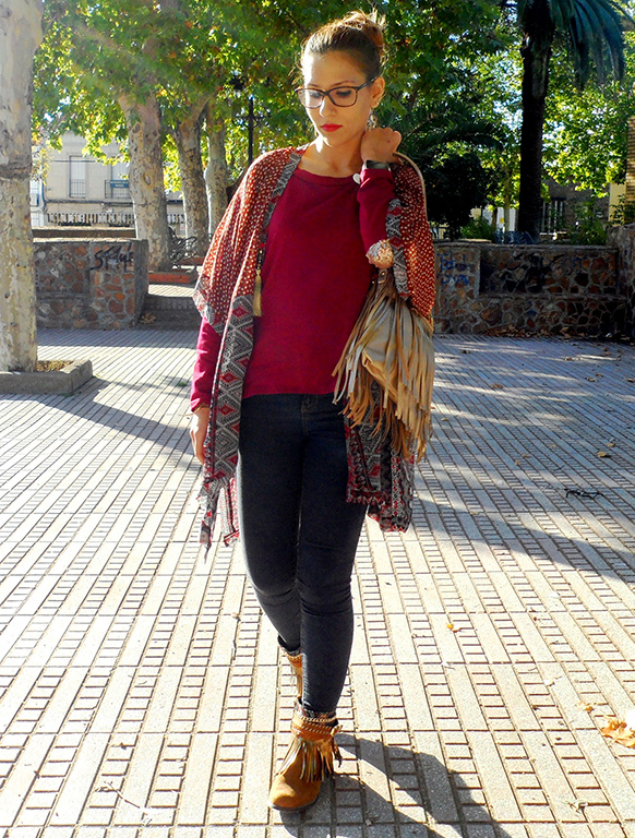 Para el look que os traigo hoy, he usado una camiseta color burdeos de manga larga con coderas de lentejuelas, combinada con un kimono de estampados étnicos y unos treggings elásticos que se adaptan genial al cuerpo.