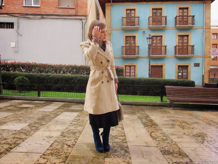 Falda sirena, camiseta perkins, botas altas y por supuesto un trench, imprescindible en días de lluvía como los que nos están acompañando. Para restarle seriedad le añadí un maxicollar y unos anillos como únicos complementos.
