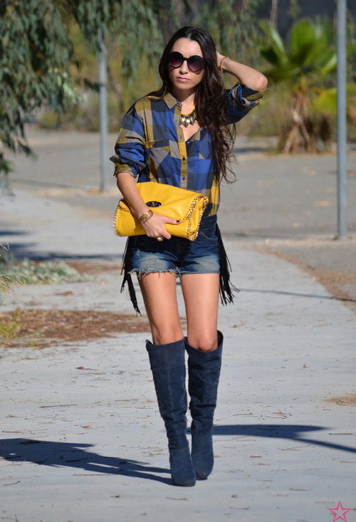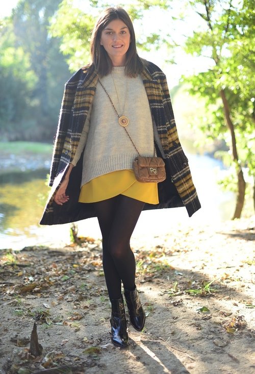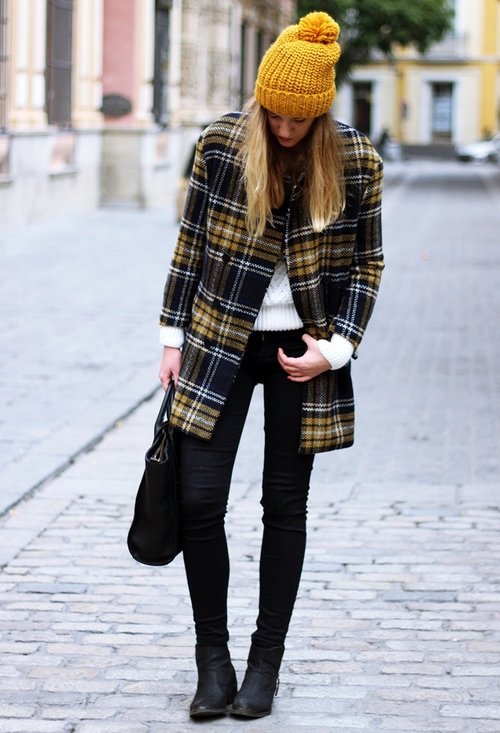 Aqui un look mostaza con una bufanda tartan.