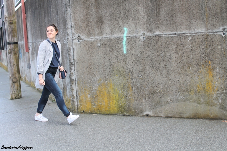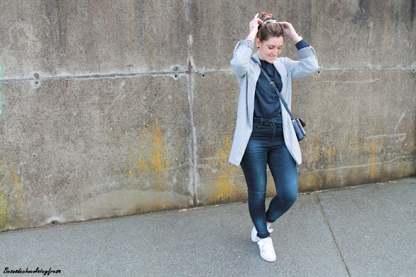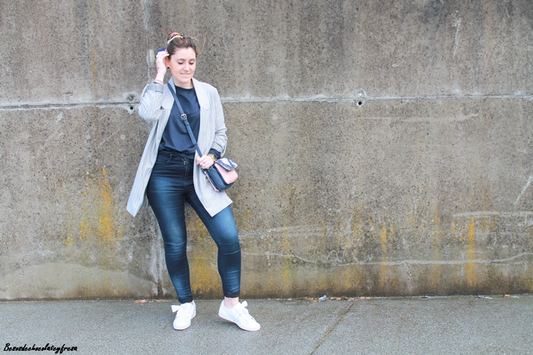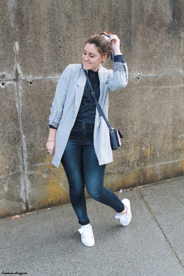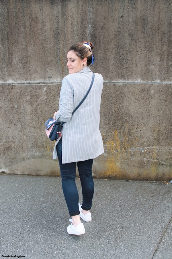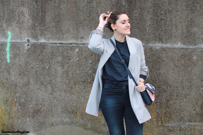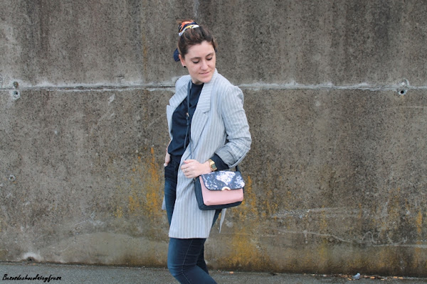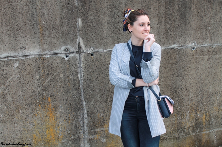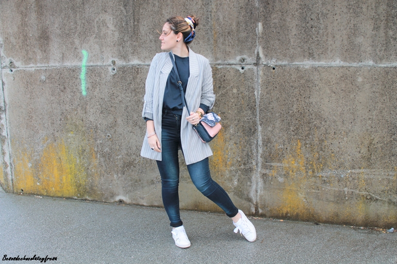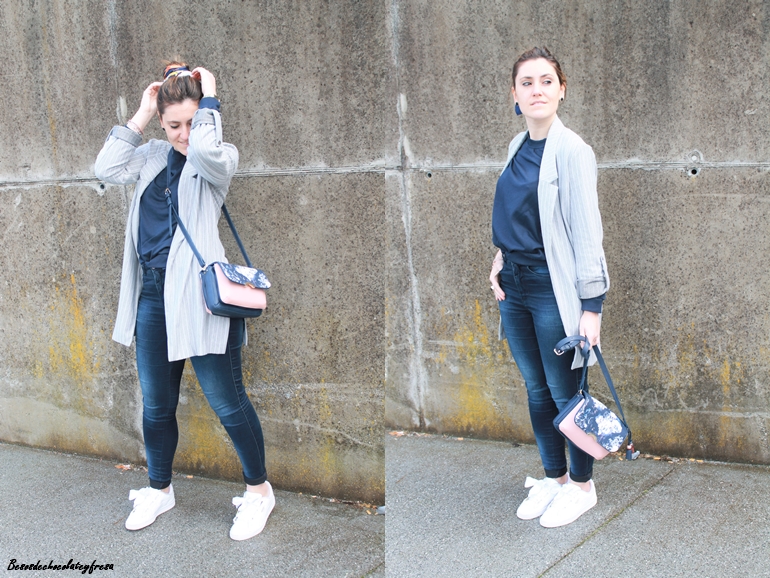 Un look en tonos azules y grises son los protagonistas, donde combino la blazer gris de raya diplomática y corte oversize sobre sudadera en azul marino a juego con el pañuelo y el bolso con pequeñas dosis de rosa y flores.