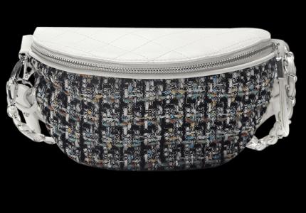 Una riñonera en mi opinión bastanta elegante, para llevar hasta la ofi, algo parecido al tan clásico y famoso print tweed usado en los diseños de Chanel.