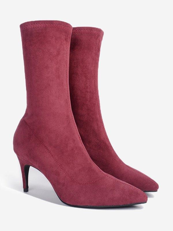 Mid Heel Pointed Toe Mid Calf Boots – Wine Red