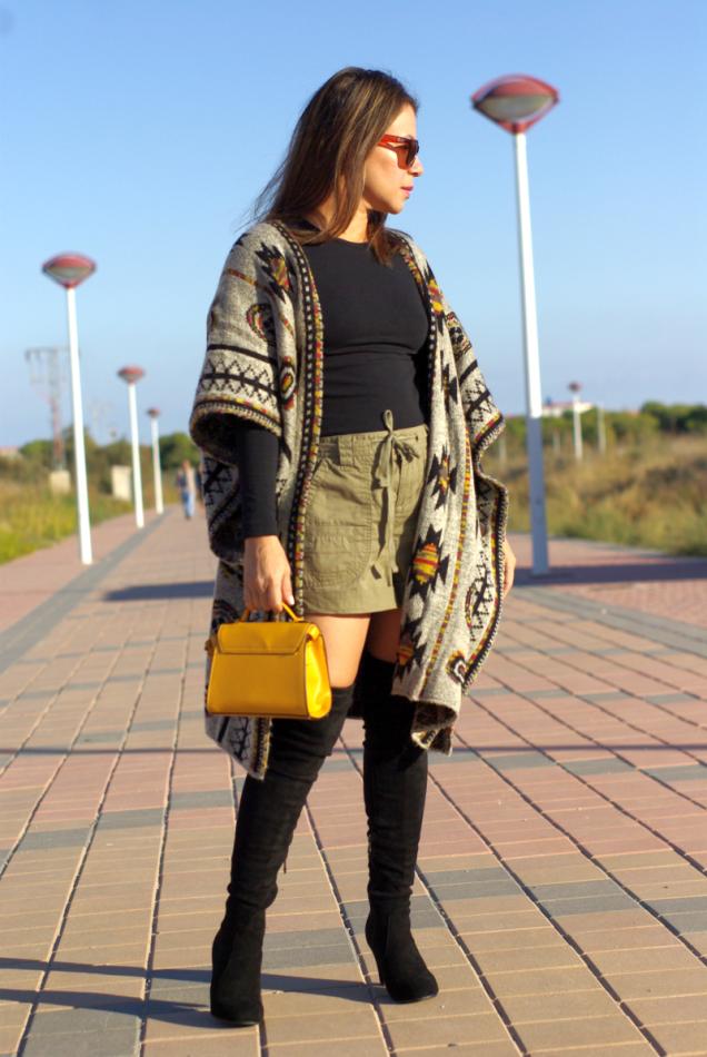 Botas xxl+shorts A quién no le gustan los shorts???, y cuando llega el frío ya es difícil llevarlos pero, con estas botas puedo dar fé de que las piernas están muy protegidas. Siempre he visto mucho este tipo de looks con chaquetas o americanas, chals o ponchos y debo decir que esta última es mi combinación favorita, sobre todo porque adoro este poncho con print étnico que también se puede llevar como chaleco, he complementado el look sólo con un mini bag amarillo.
