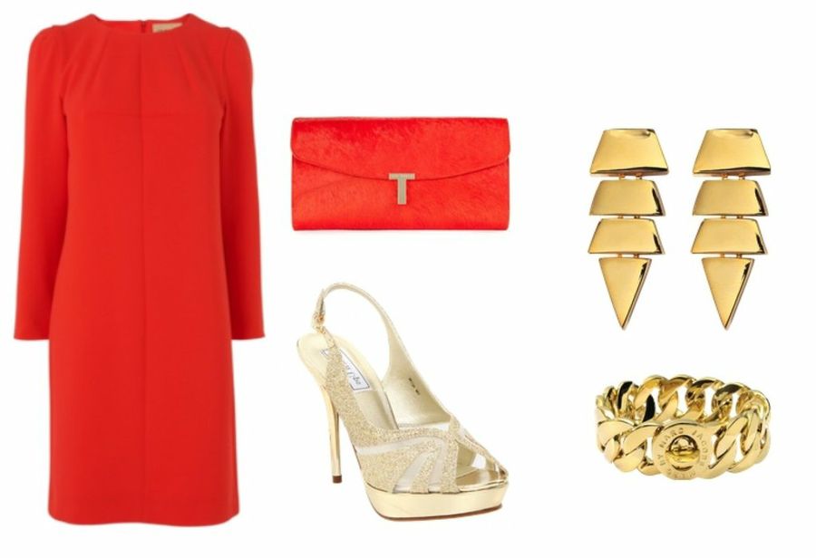 El rojo es otro de los tonos más habituales en las fiestas de Navidad, ya que no sólo es uno de los más significativos de estas fechas, sino que, además, nos ayuda a conseguir un toque sensual sin perder sofisticación. Uno de sus eternos compañeros es el color dorado, sobre todo de cara a fechas festivas, por lo que unas sandalias de este tipo serán perfectas. Para nuestro bolso elegiremos el mismo tono del vestido e incluiremos unos maxi pendientes y pulseras en dorado.Nude