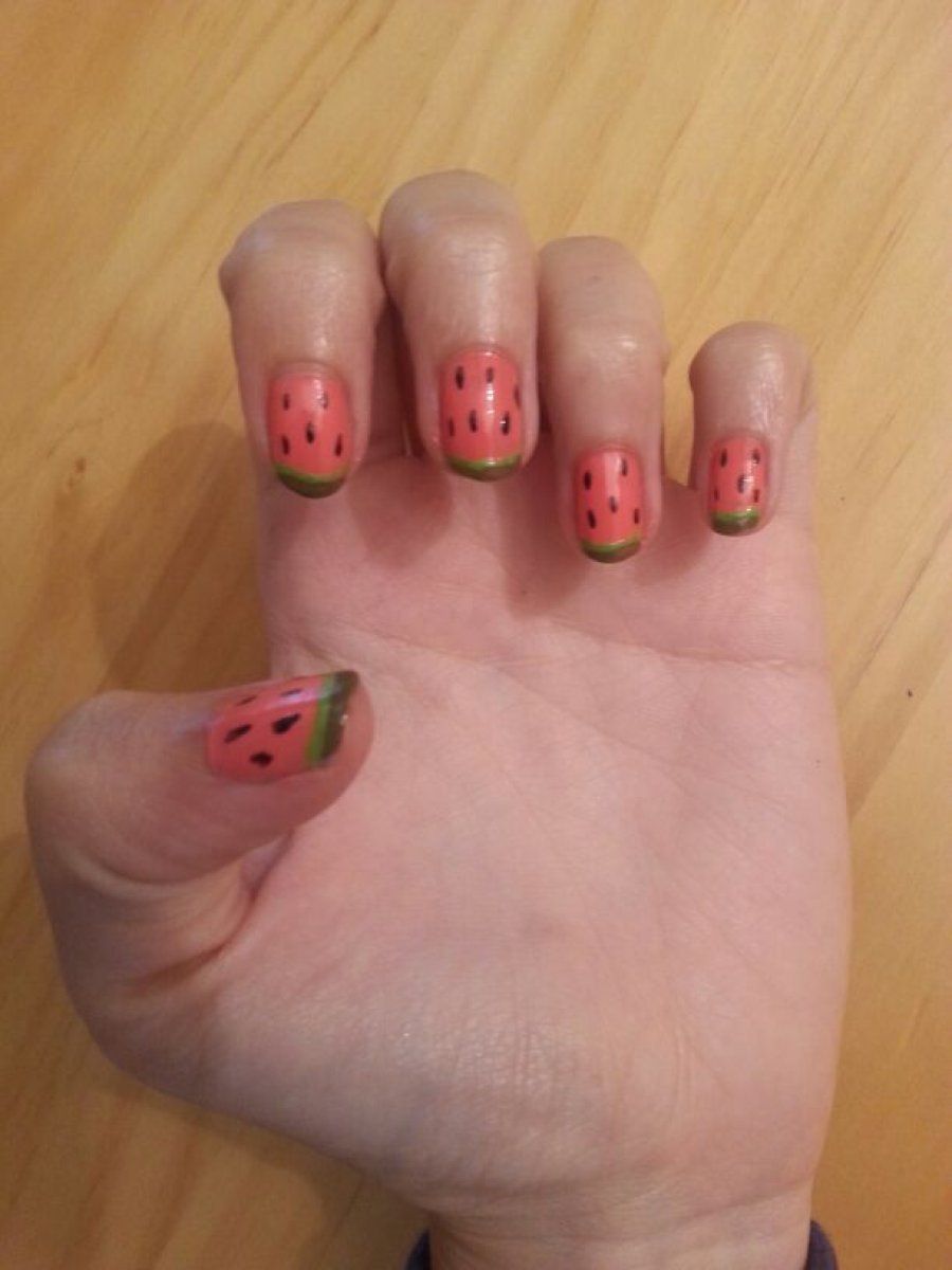 Para llevar unos graciosos emoticonos sobre nuestras uñas tendremos que hacernos con un pintauñas amarillo y un rotulador negro para decorar uñas. Pintaremos la base con el color amarillo, del que recomendamos aplicar dos capas para que el resultado sea más llamativo. Cuando estén bien secas ambas capas dibujaremos los smiles con el rotulador, podemos jugar con diferentes expresiones para que el resultado sea más divertido. Si queréis que dure más tiempo, podréis aplicar como toque final una capa de brillo.Manicura de sandías