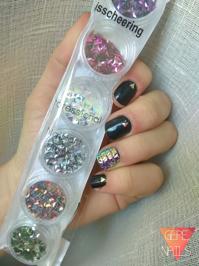 Vienen en un paquete de 6, de diferentes colores. En cada botecito, van un MONTÓN de triángulos. Podéis comprarlos AQUÍ, o poniendo en la web: "3D Triangle sequins set". Valen 4.60€.