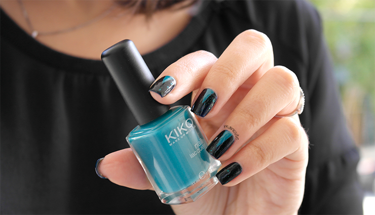 Como siempre, me ayudé de unas nail tapes para hacer los triángulos. Al haber utilizado antes de este paso un esmalte de secado rápido, no tuve ningún problema al retirar las nail tapes. Como veis, usé un tono turquesa muy bonito de KIKO, el 387.