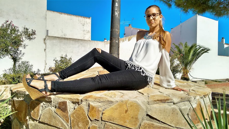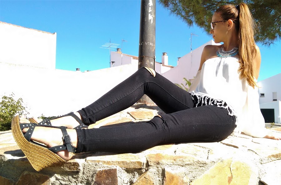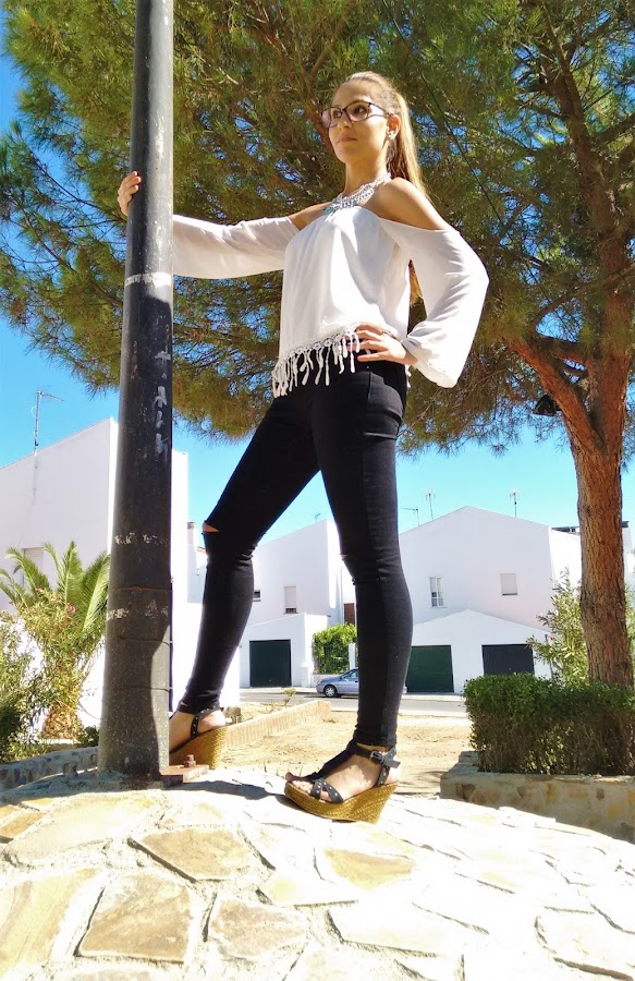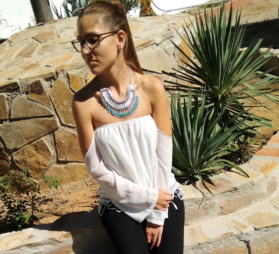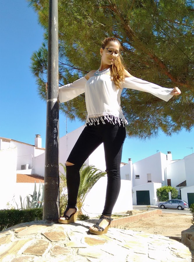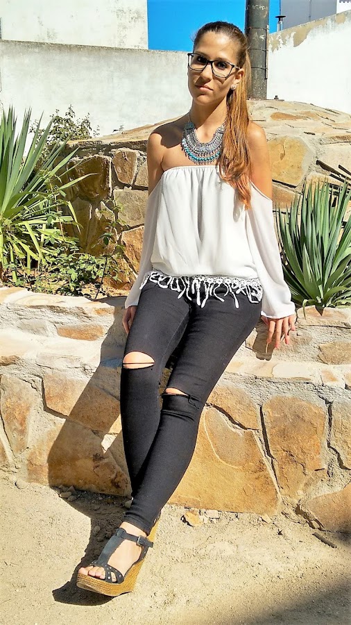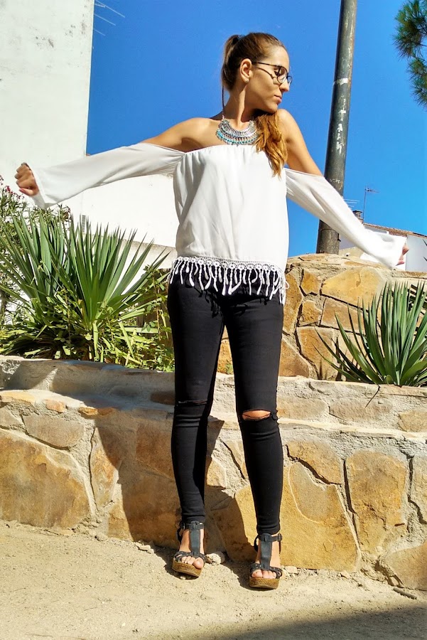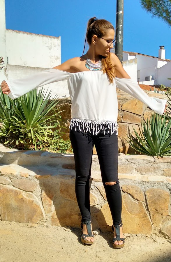 Lo he combinado con una blusa blanca de hombros descubiertos, para que destaque más el collar y mis ripped jeans negros.