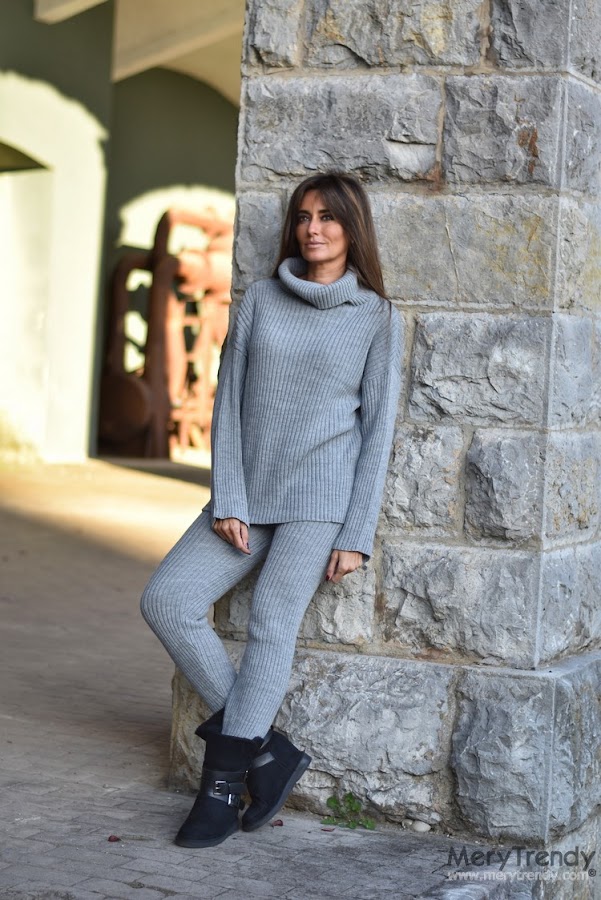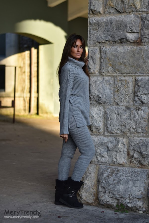 El segundo, un outfit de punto más arreglado que me hará sentir impecable de la mañana a la noche y que constata que el reinado de los leggins va más allá del gimnasio y los domingos por la tarde en casa; en una tonalidad además que destaca por su facilidad para ser combinada con otros colores o, como en este caso, entre ellos. Por eso he apostado por el total look en esta gama.