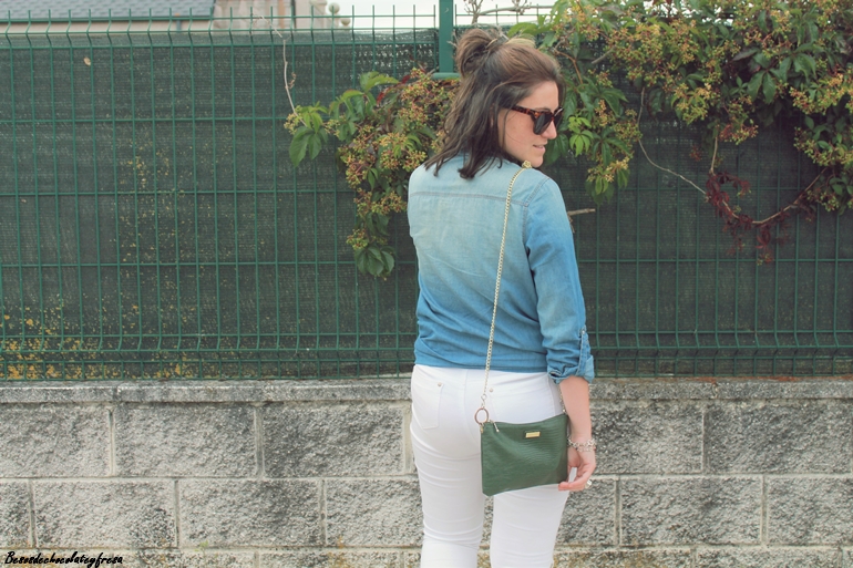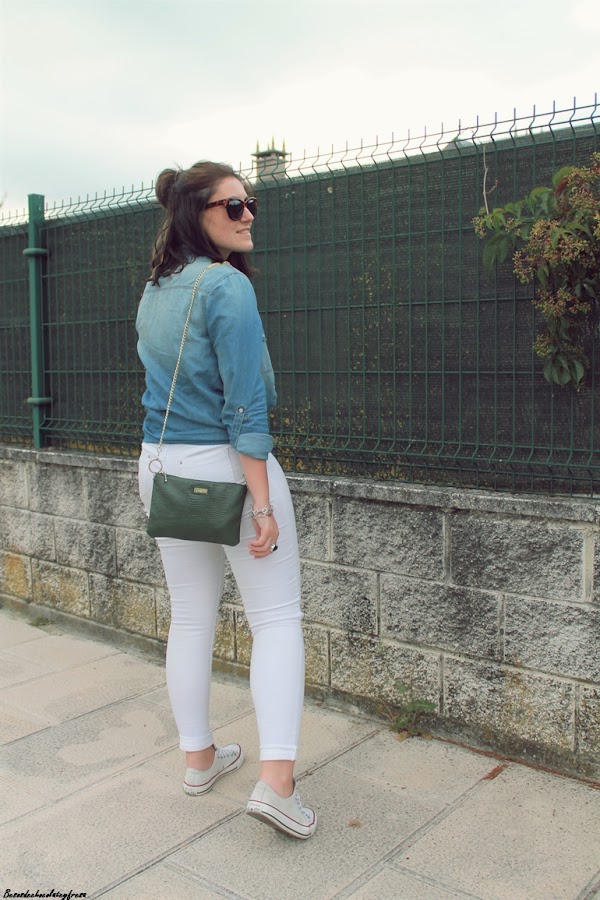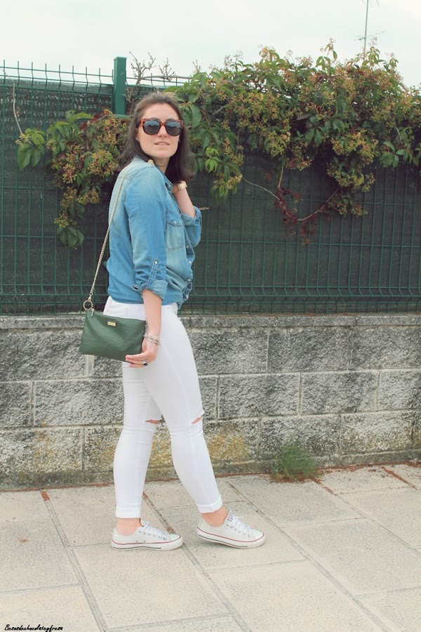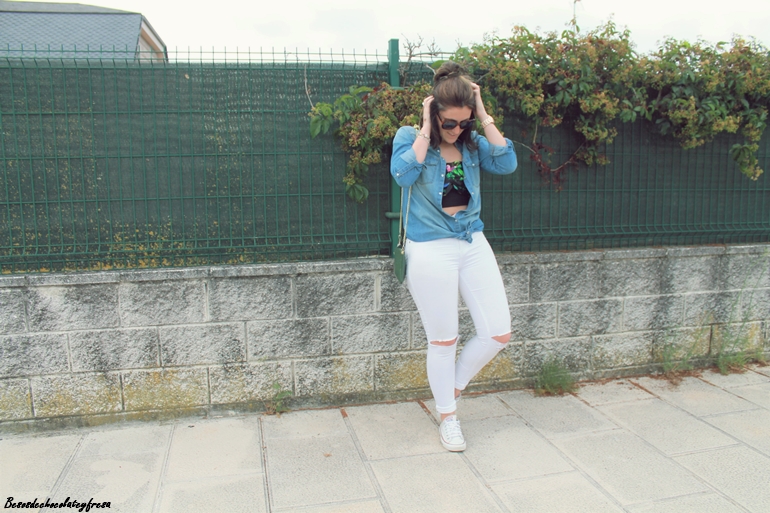 Jeans blancos con rotos de tiro alto, converse, bolso en verde y camisa anudada dejando ver todo el top al descubierto, completan el look.