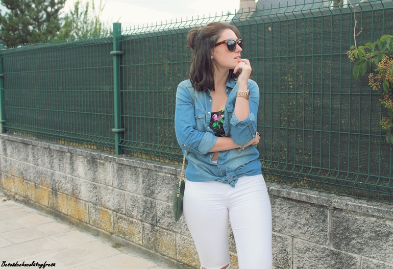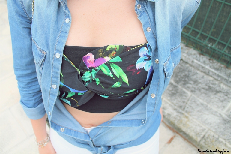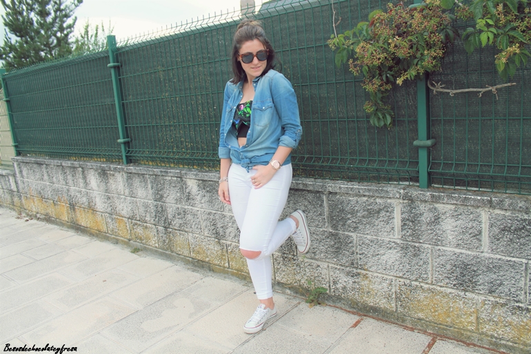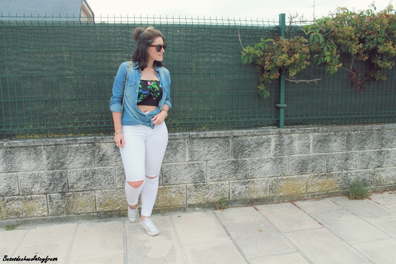 Para una jornada de recados, tapeo y a la noche con concierto incluído, aposté por un look relajado pero con toques chic y atrevidos. El crop top es de estas rebajas (por lo que aún podeis haceros con el o alguno similar, hay infinidad de ellos ahora y este mismo lo hay también en azul klein y verde, que no descarto hacerme con ellos tambien). Es de punto negro, tirantes y con el detalle anudado de la tela de estampado tropical en tonos verdes y azules.