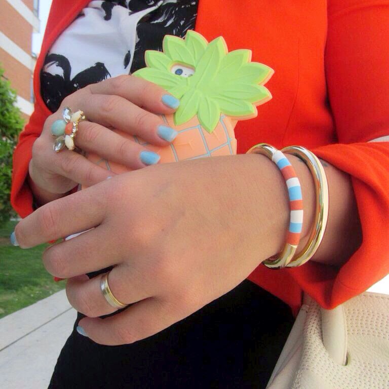 Una camisa con palmeras pero en tonos negros y blancos me pareció la opción perfecta para utilizar este print sin caer en el exceso, en cuanto la ví en OASAP, quedé totalmente enamorada. El toque de color al look se lo dí con el blazer y qué mejor que mi nueva carcasa "piña" para el toque divertido.