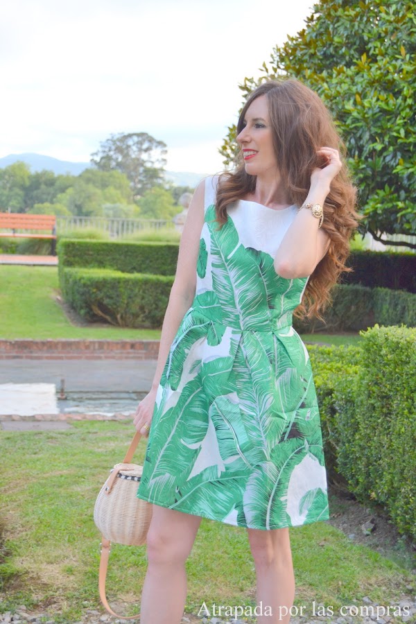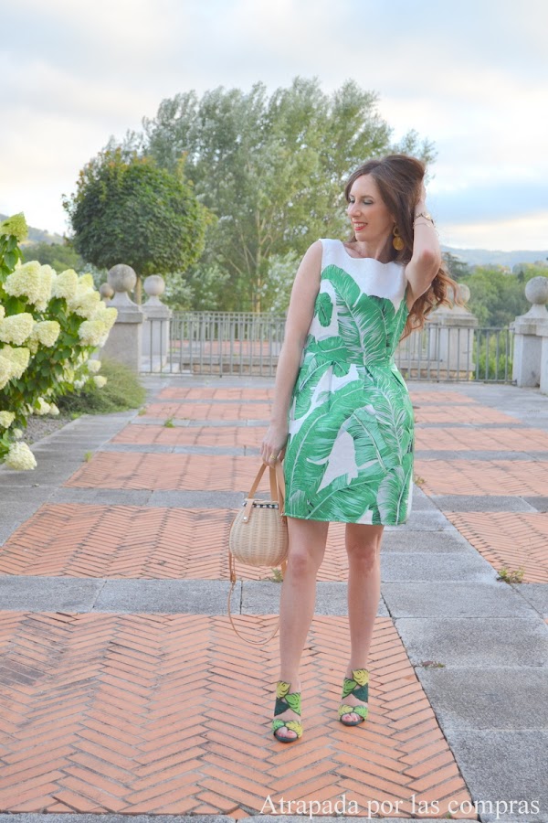 Pero vamos a lo importante, vamos al look de hoy, un look de verano, aunque por Asturias se nos quiere resistir un poco. Y si hay algo totalmente veraniego es el estampado tropical, un estampado que este año está de super tendencia y si a él le sumamos el verde esmeralda de las palmeras el resultado no puede ser más perfecto. EL look de hoy es totalmente tropical, por un lado un vestido con estampado de hojas de palmeras y por otro unas sandalias de hojas y tacón fino, pura debilidad..... Como bolso un imprescindible de esta temporada, una cesta de rafia. Y como complementos una pulsera que ya me habéis visto en varias ocasiones y unos pendientes de Capim Dourado, también conocido como Oro Vegetal, que compré en el Mercado Clariniano que se celebró en Candás a finales de junio. Qué os parece el look?