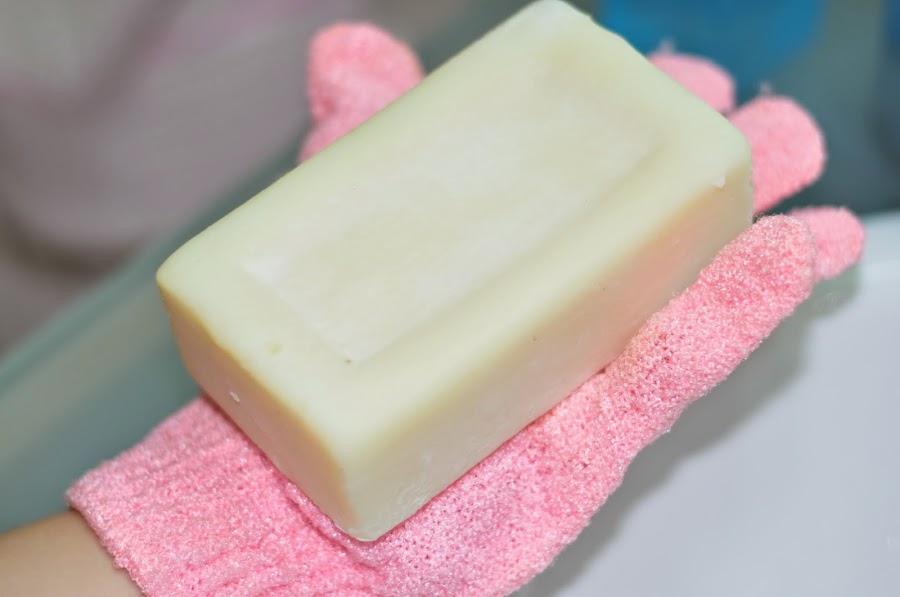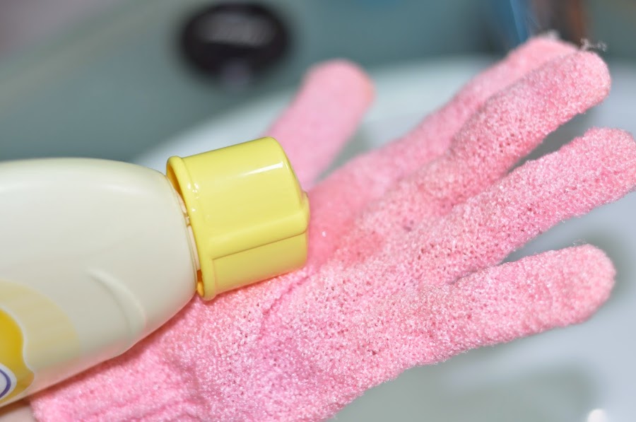 Nos ponemos el guante le echamos una gota de jabón,en este caso es jabón de Nenuco....