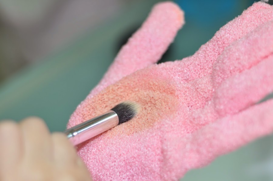 Si no tenéis el famoso guante para limpiar las brochas,como es mi caso,lo podemos sustituir por un guante exfoliante.El mío me vino de regalo con una revista y lo tenía " muerto de risa" en el armario.