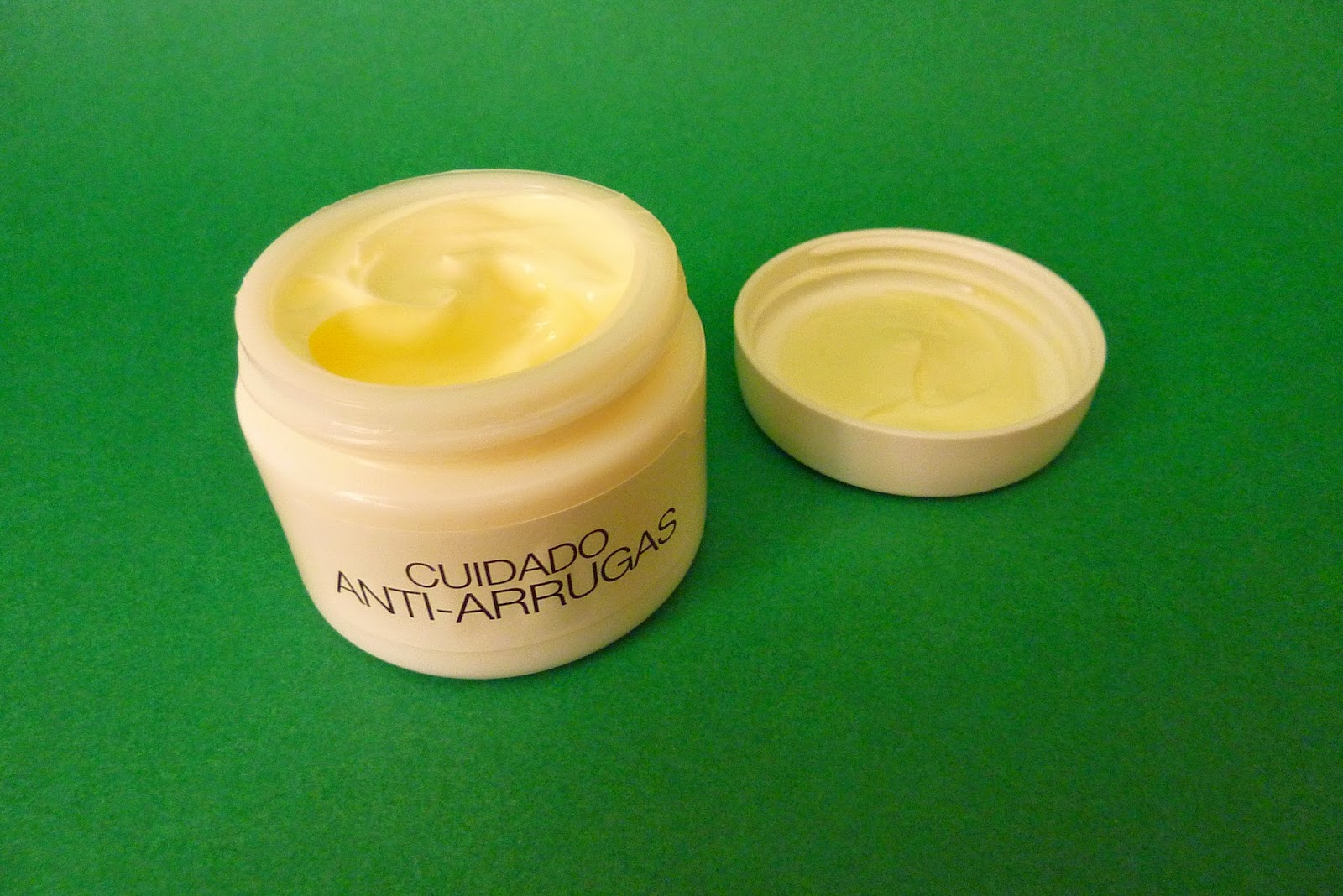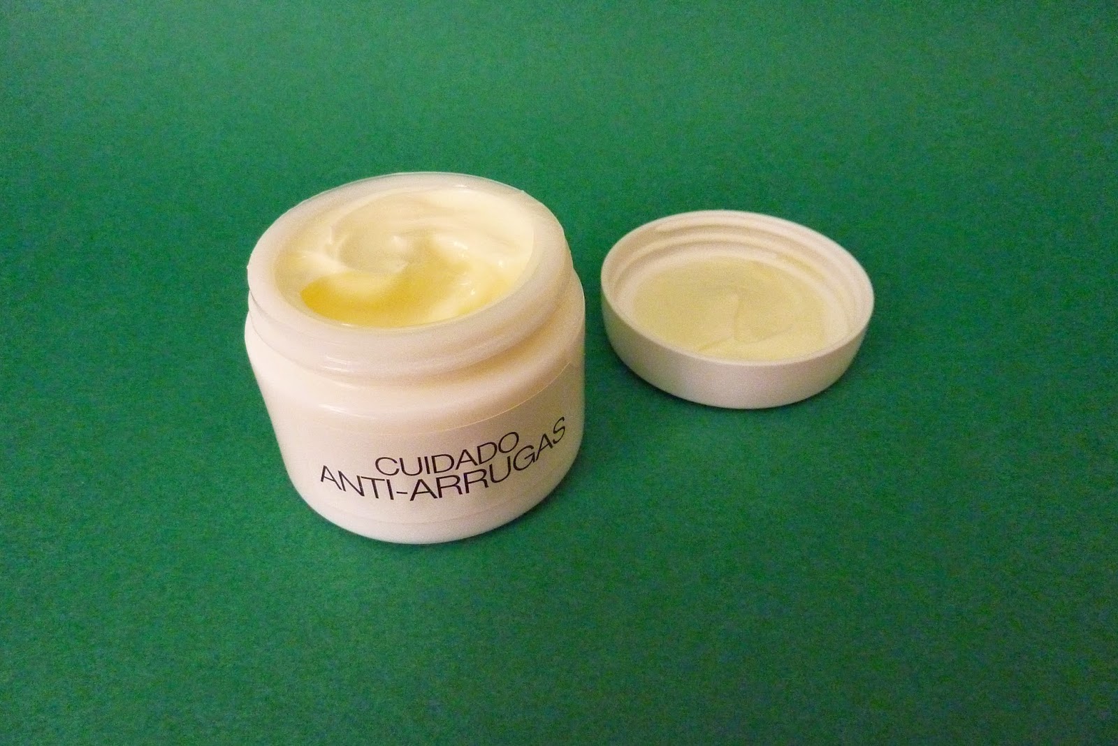 Como véis la crema en este caso viene en un tarro blanco muy sencillo, donde se lee Crema Antiarrugas tiene un color beige y un olor muy discreto y agradable.