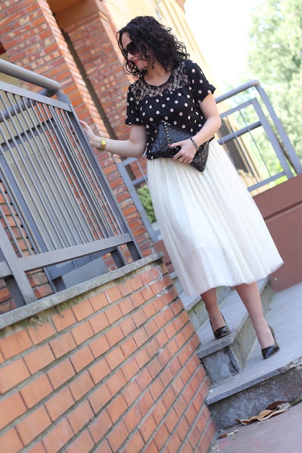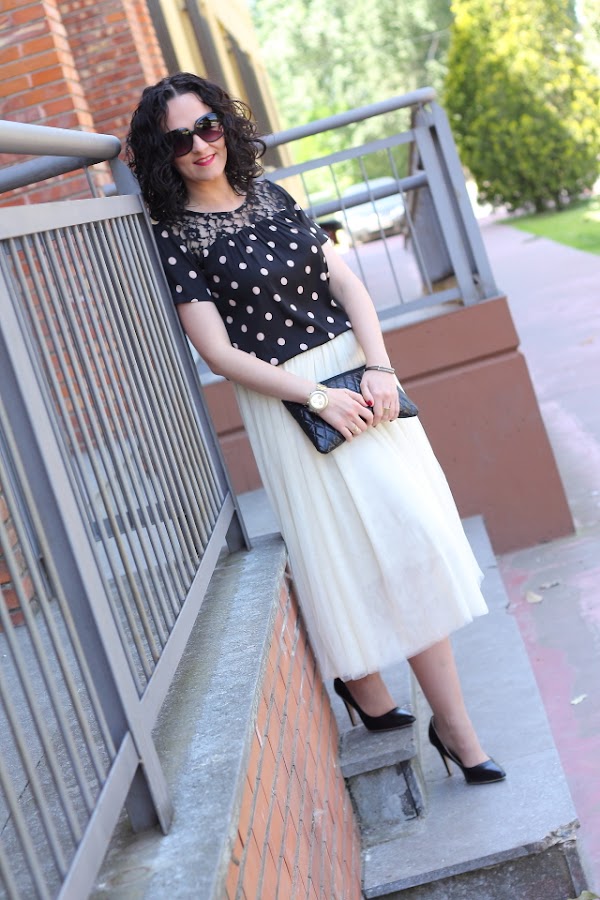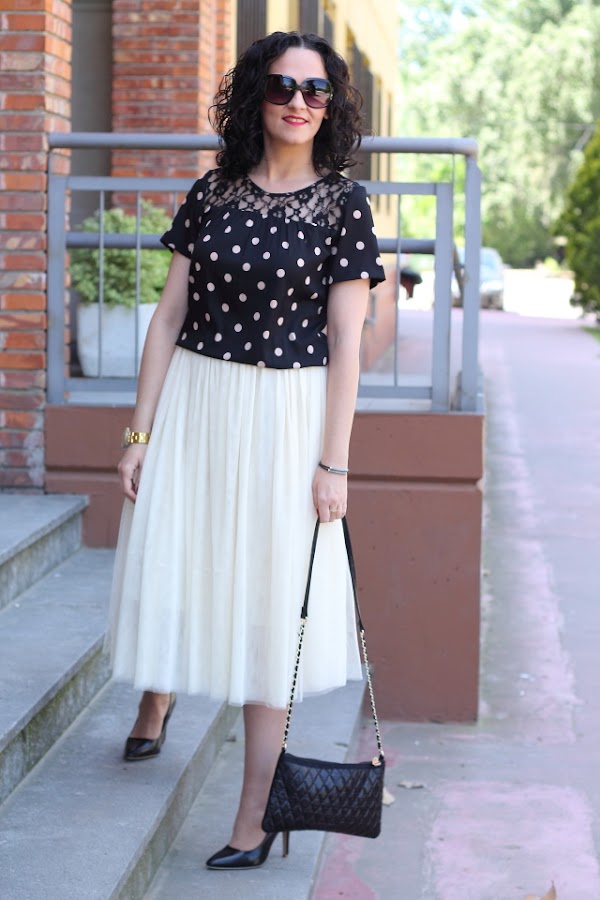 Me encantan las faldas de tul en todas sus formas, ya sean cortas, largas, voluminosas..., en definitiva me vuelven loca. Hace un tiempo os comenté aquí que tenía muchas ganas de hacerme con una y por fin la he conseguido, al tener ya una negra me he decantado por esta de corte midi en color beige. Este verano con camisetas de tirantes básicas y cuñas la voy a llevar muchísimo pero este día me apetecía un look más chic, así que la combiné con una blusa que combina dos cosas que me gustan mucho como son los topos y el encaje.