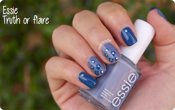 El azul claro, que he utilizado en las uñas del corazón y el anular, es el Truth or flare. En el frasco se le ve más grisáceo de lo que es, puesto que una vez en las uñas, con dos capas, se convierte en un azulón grisáceo con toques lavanda que me encantaría para combinarlo con un bonito jersey de lana blanca o cruda, para los días más fríos de invierno.