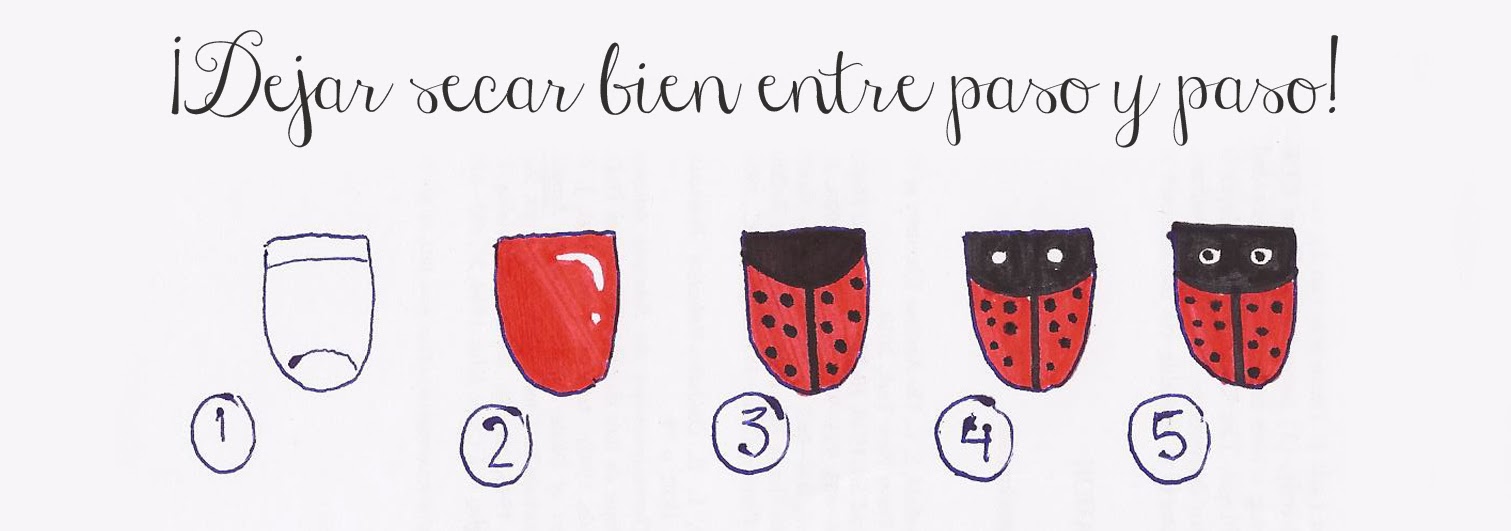 Con la dotting tool por su extremo grande, dibujamos unos círculos alargaditos: serán las cabecitas de las mariquitas. Por la parte pequeña, pintamos cuatro puntitos sobre las manchas rojas.