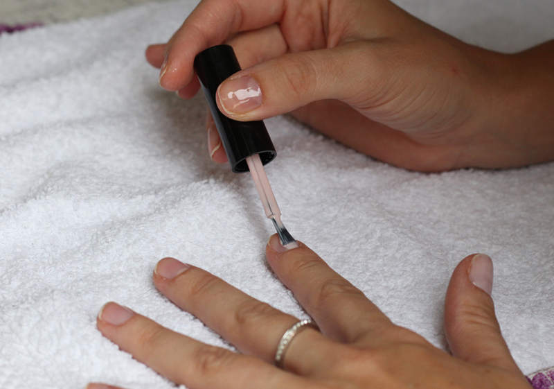 El primer paso del esmaltado profesional de Masglo para la mancura semi-permanente es el esmalte de BASE, de color transparente que aplicaremos en una capa muy muy fina por toda la uña y bordes.