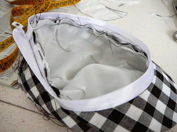 Ribeteamos todo el contorno de la gorra con una cinta al bies ,