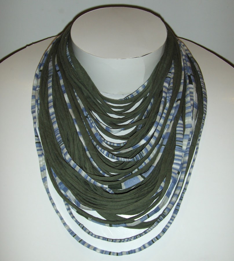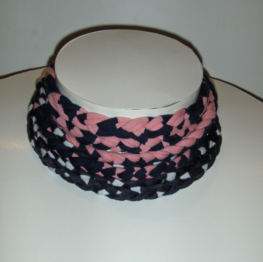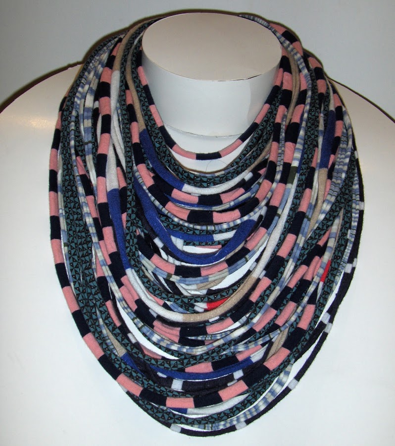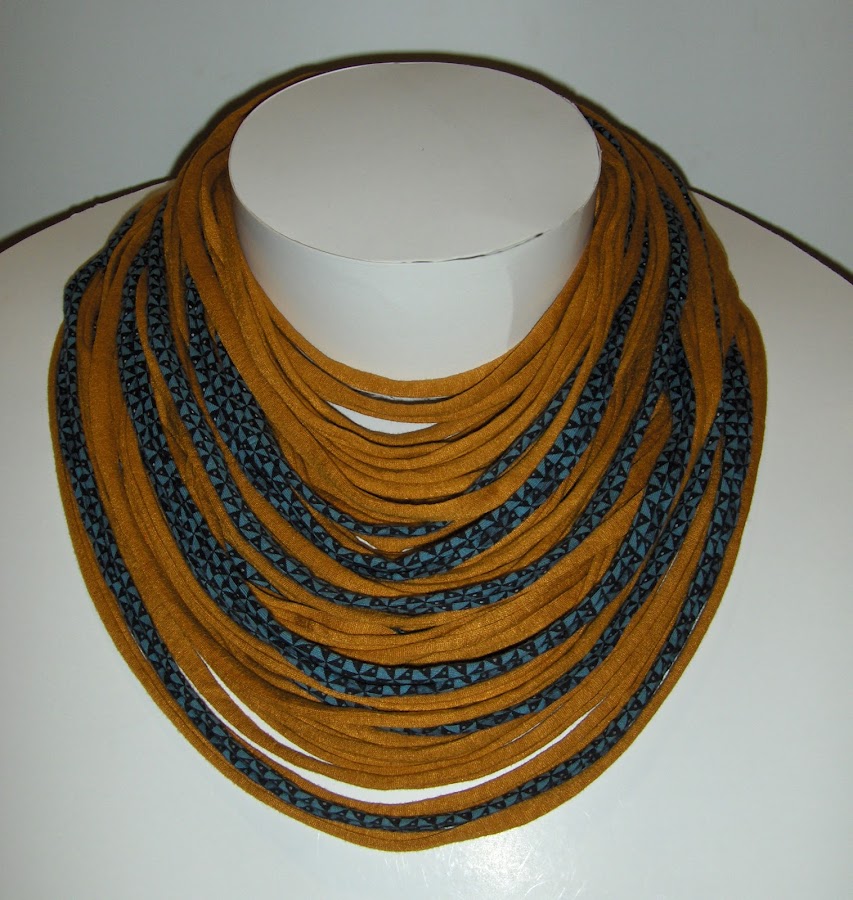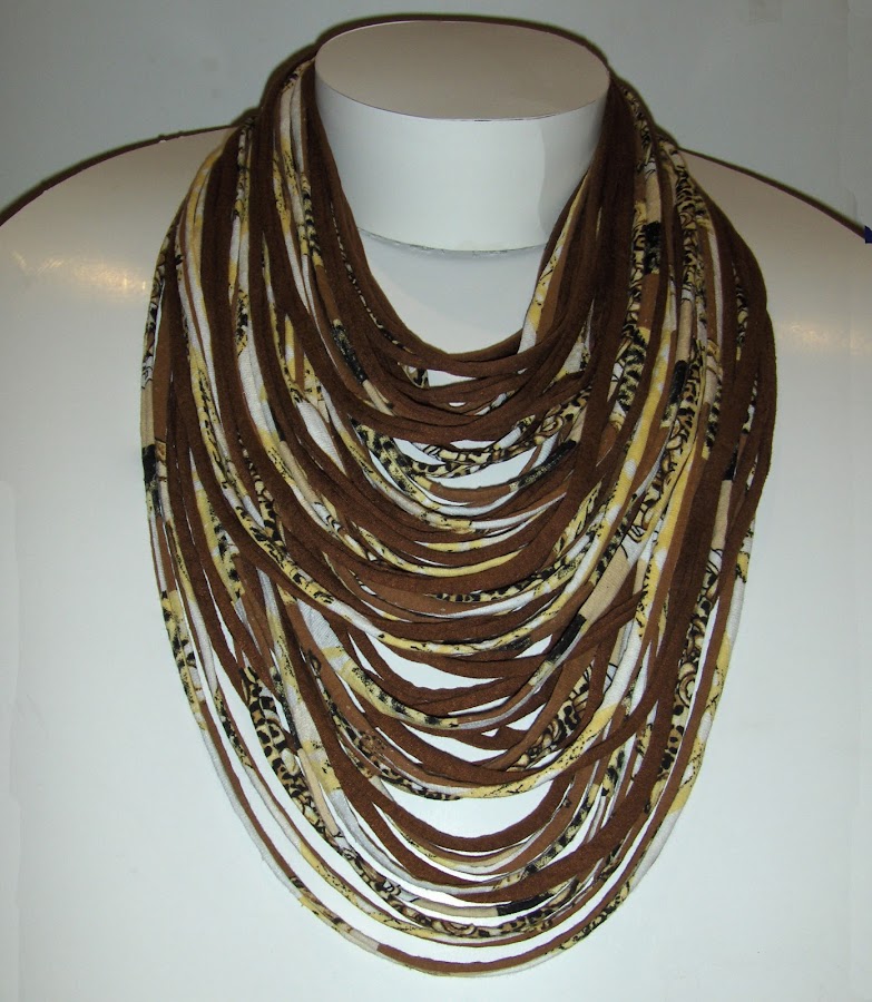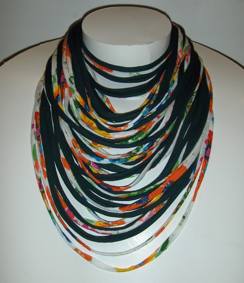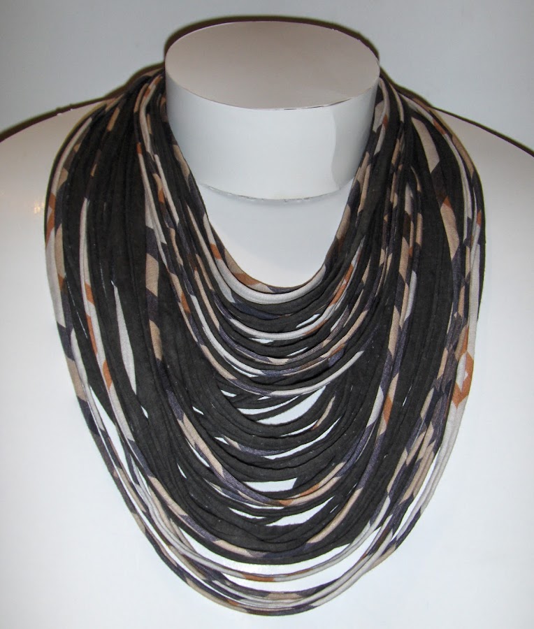 Este material se puede comprar en ovillos y se utiliza para confeccionar lo que comúnmente llamamos "mantas de tiras". Si se realizan los trapillos con viejas camisetas se obtiene el mismo resultado y se logran estos originales collares, algunos de ellos tan calentitos como pañuelos debido a su tamaño.