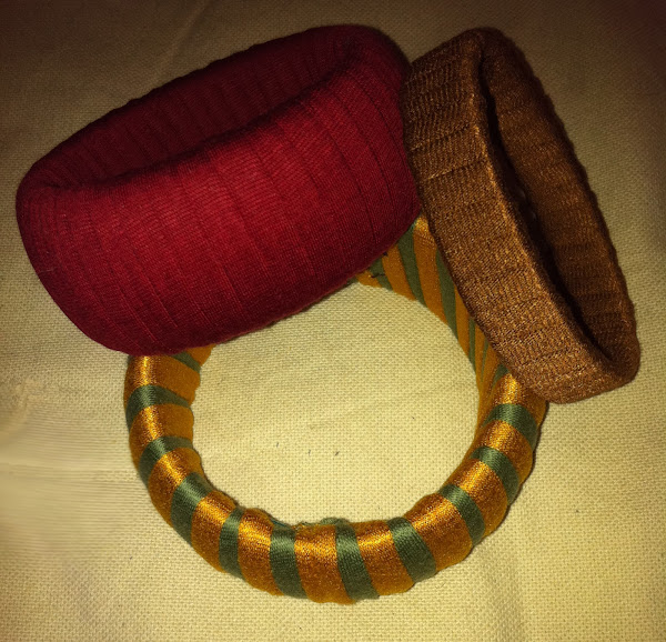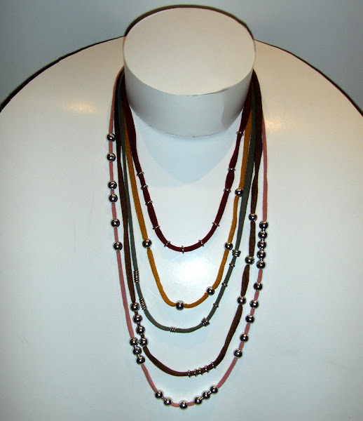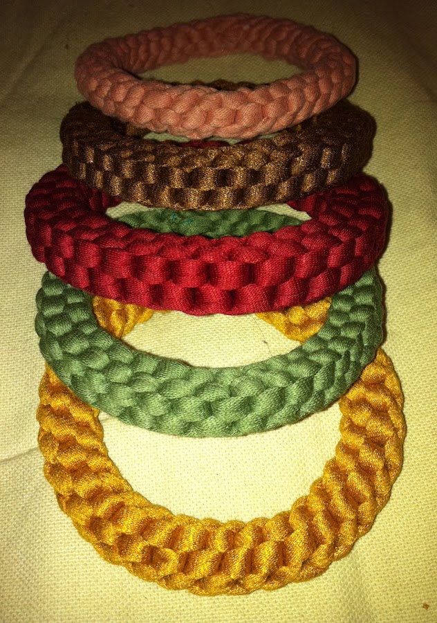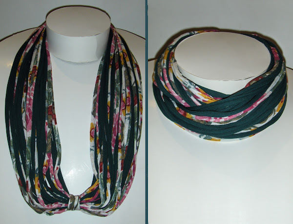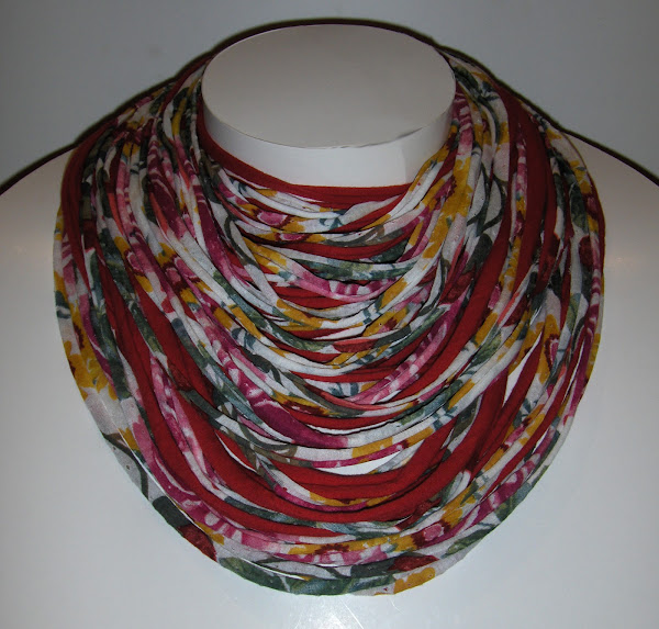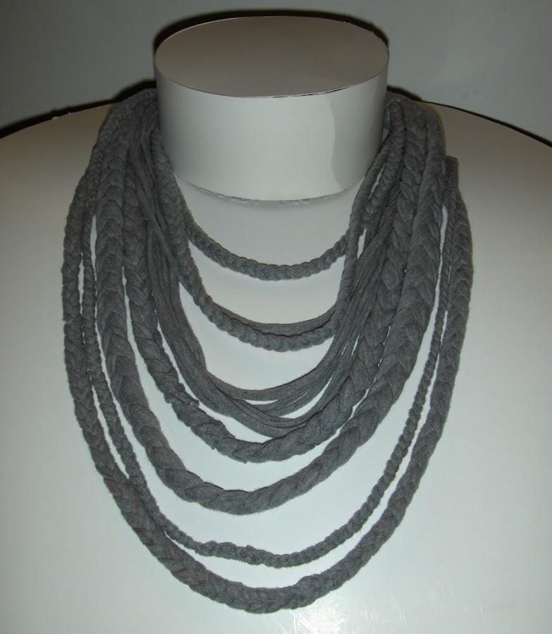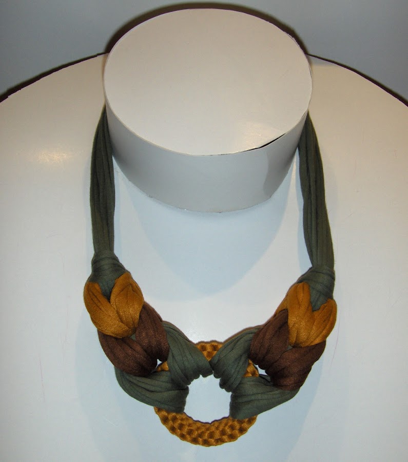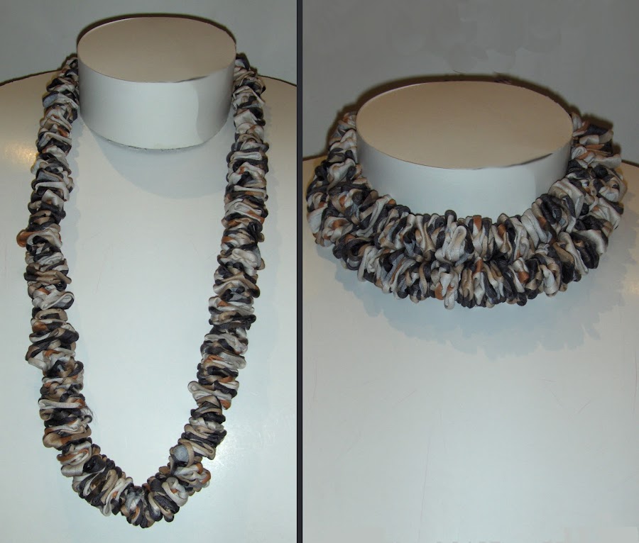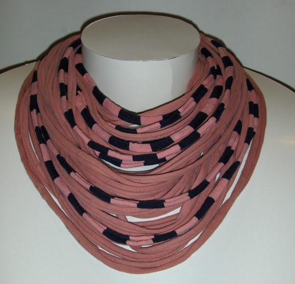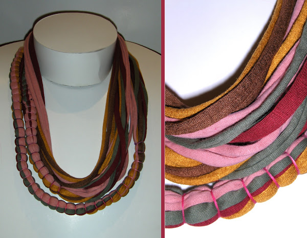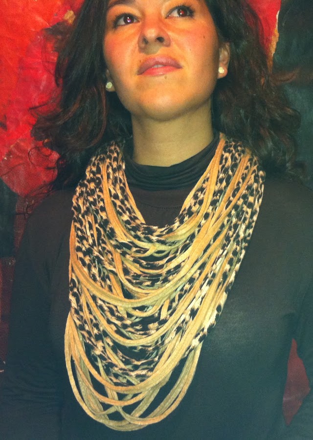 Este material se puede comprar en ovillos y se utiliza para confeccionar lo que comúnmente llamamos "mantas de tiras". Si se realizan los trapillos con viejas camisetas se obtiene el mismo resultado y se logran estos originales collares, algunos de ellos tan calentitos como pañuelos debido a su tamaño.