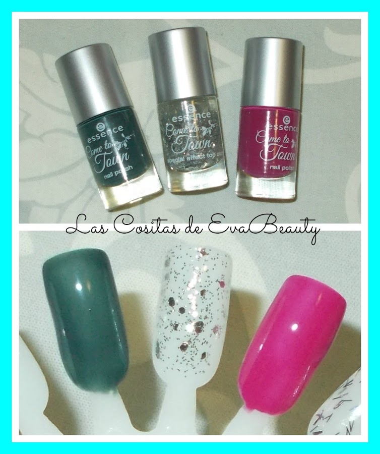 Y cogí éste pack de 3 esmaltes de la colección Come to Town de Essence. Contiene un esmalte verde musgo que me encanta el tono, un top coat con glitter y un esmalte tono fucsia también precioso.
