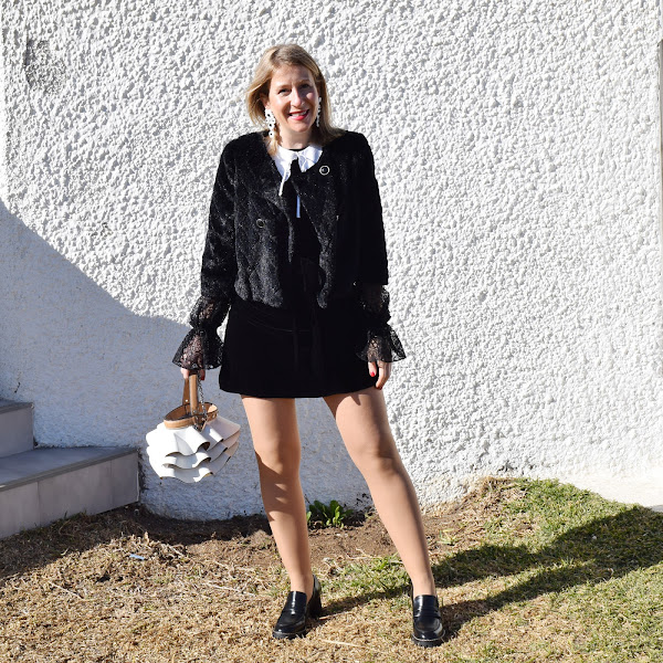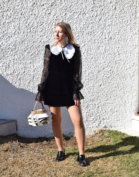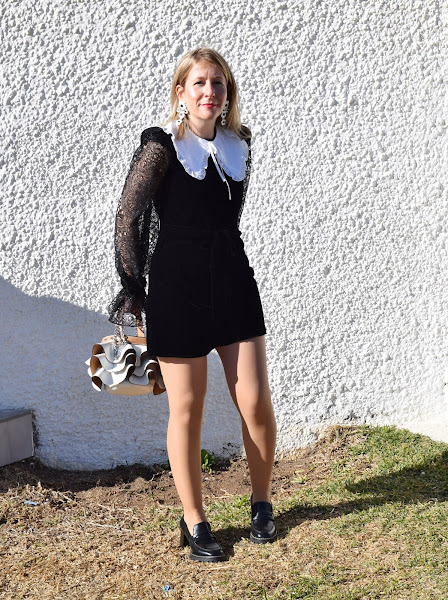Un minivestido de terciopelo, con mangas de encaje y cuello bebé falso, que puedo reutilizar en muchos looks futuros.
