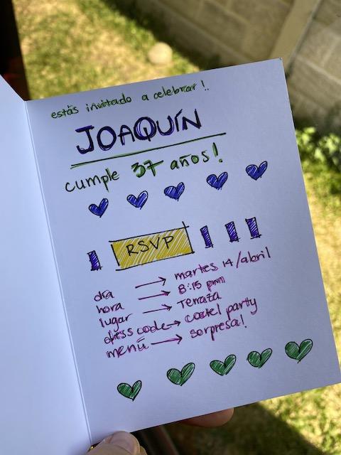 A esa hora le entregué una tarjeta donde le hice una invitación para la celebración: hora/lugar/dress code/menú. Sentí que de esta manera lo dejé interesado e intrigado de lo que faltaba para seguir celebrando todo el día, le di mayor importancia al planear un coctel, obligándonos a vestirnos mejor y olvidar que seguimos aquí adentro solitos.