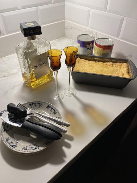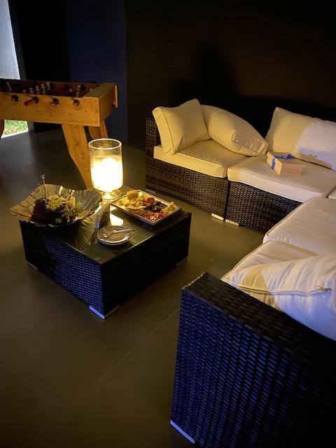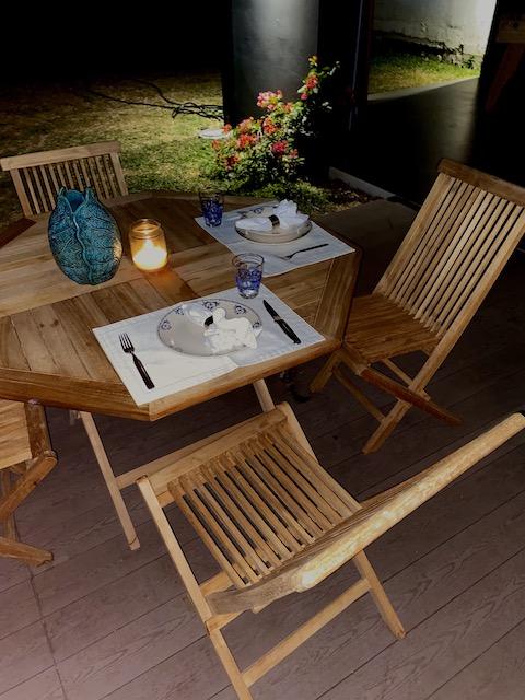 Ordené de manera que hicimos como estaciones dentro de la casa: primero le pedí que escogiera él el vino en la cocina, donde solamente estaban las copas y brindamos. Luego pasamos a la terraza donde había dejado un antipasto y su regalo. Finalmente la mesa estaba servida con el plato fuerte.