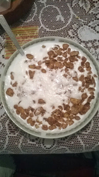 Ya me duché y arreglé mi cabello, ahora en la cocina preparo mi desayuno preferido que son leche con cereales, por aquí les dejo una