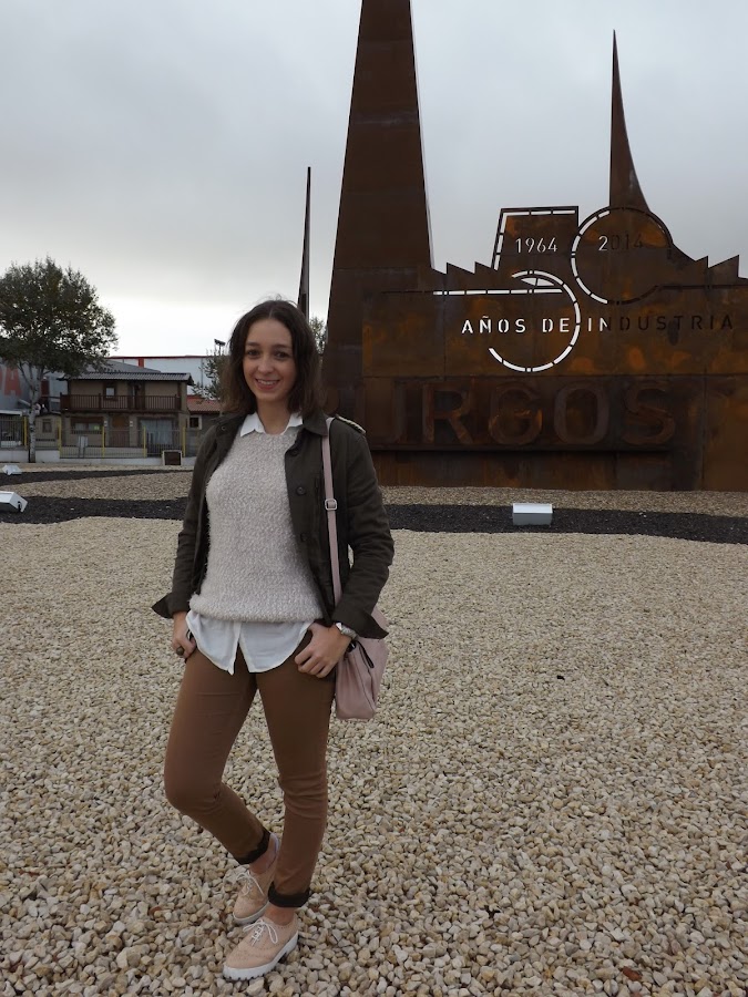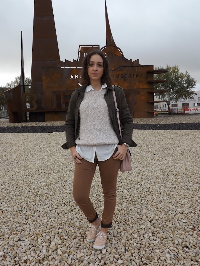 Pantalones en camel, jersey beige y camisa en blanco asomando por debajo con una parka verde. Complementos en rosa y ¡voilá!