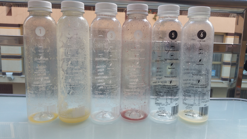Aquí la imagen de los 6 zumos finiquitados. Cuando acabas, te das cuenta de que no ha sido para tanto, que se ha pasado el día tomando sólo zumos y divinamente y te sientes muy ligero y a la vez vital.