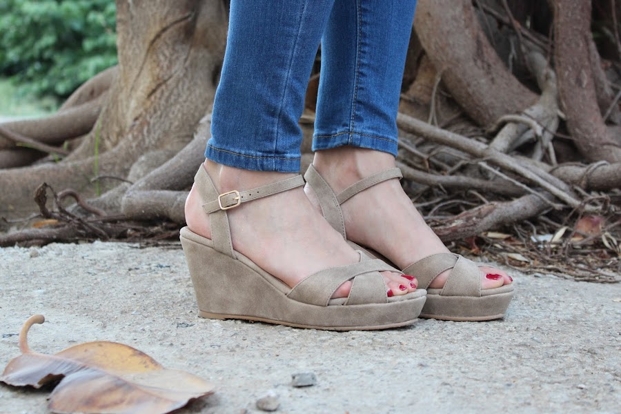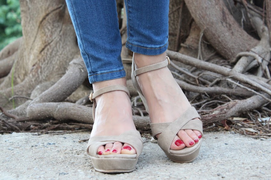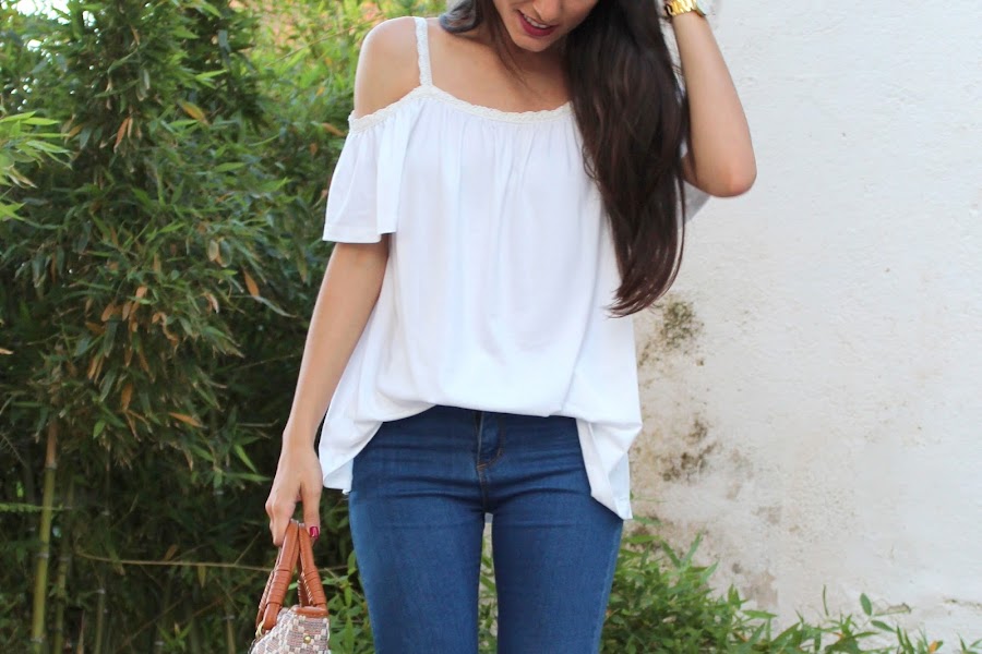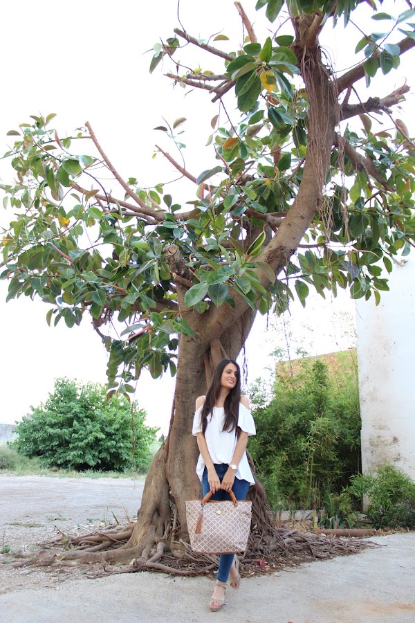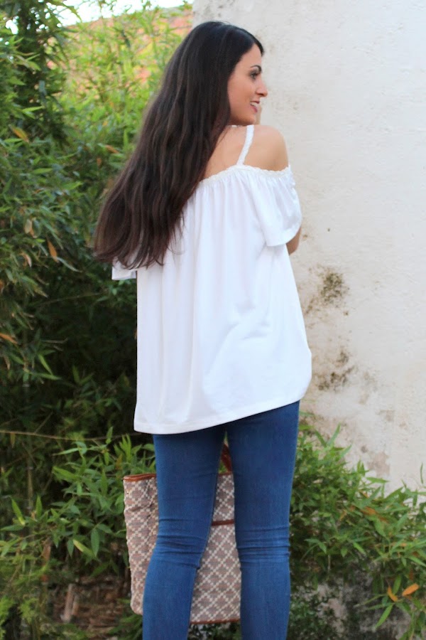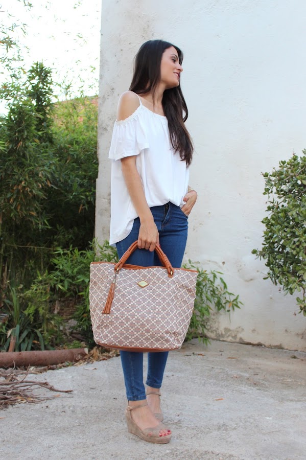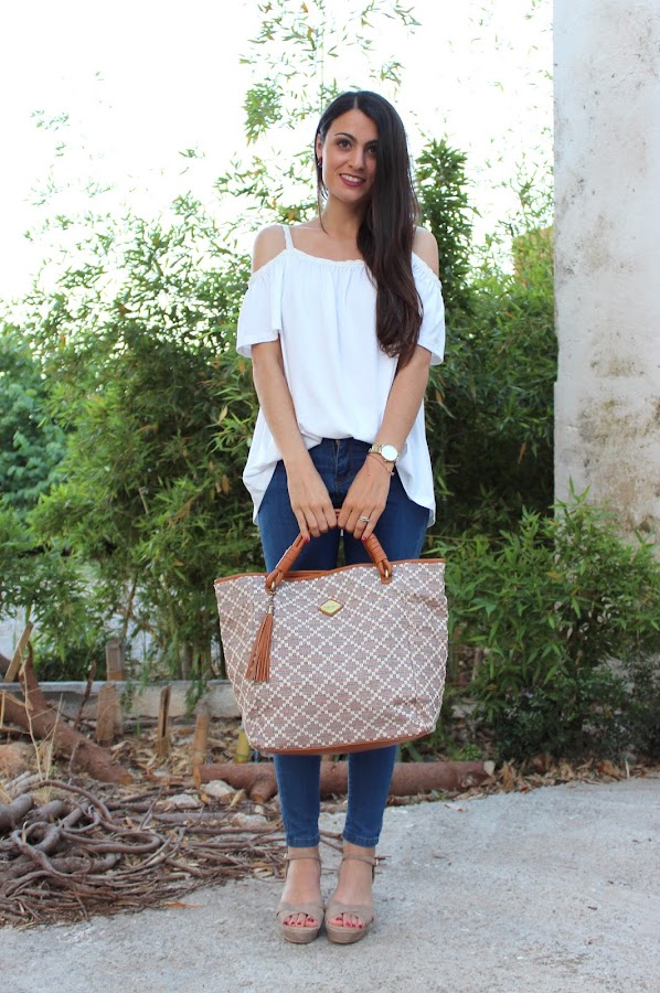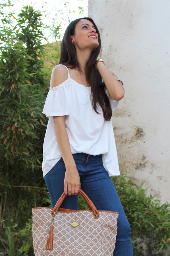 En el look de hoy estreno una preciosa blusa blanca, unos pendientes y unas sandalias y un bolso!
