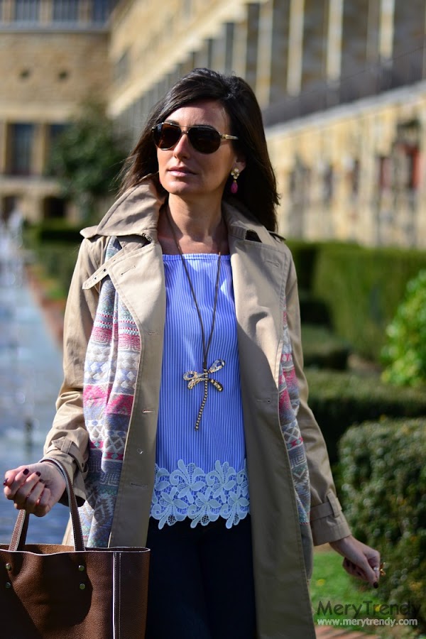 Una preciosa pashmina multicolor, confeccionada en un tejido maravilloso, que la hace suave al tacto... muy amorosa; un original colgante-libélula articulado; un maxi-anillo dorado con forma de estrella de mar; unos vistosos pendientes, también en dorado y con piedras en rosa, a juego con las tonalidades de la pashmina y una blusa de rayas en azul y blanco con detalle de bordados, muy fresquita e ideal de cara a la primavera.