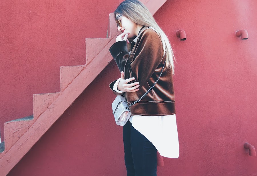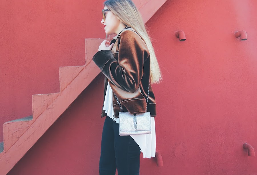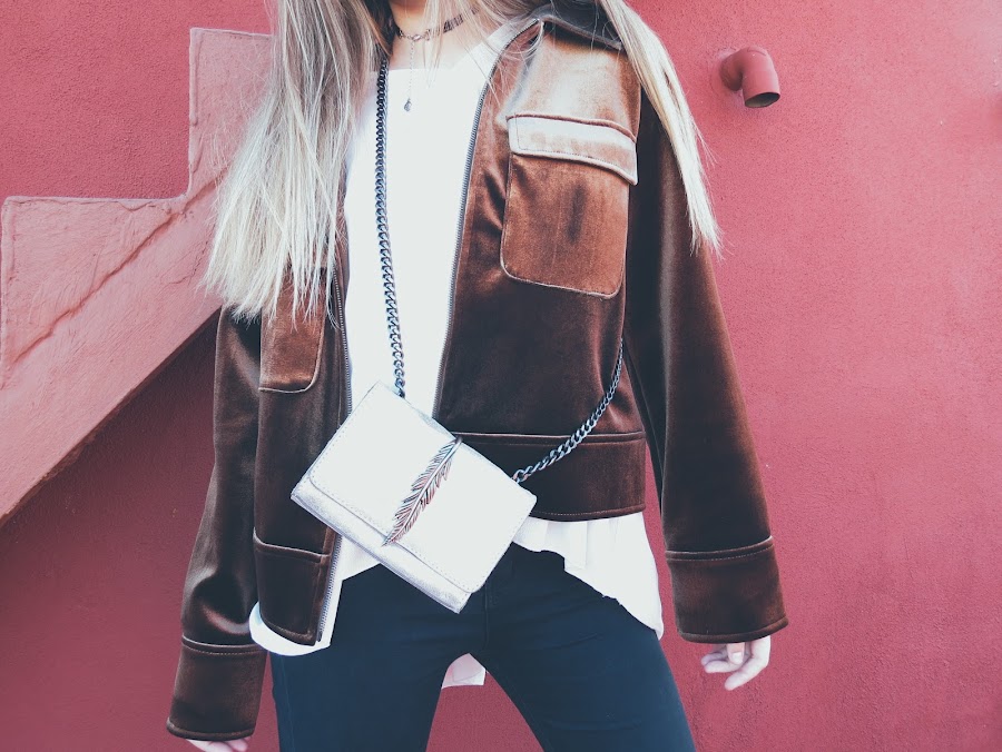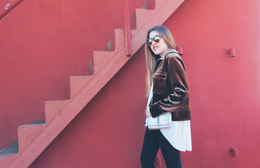 I really like the overlap of garments. Today Im wearing a velvet jacket and a white blouse underneath.