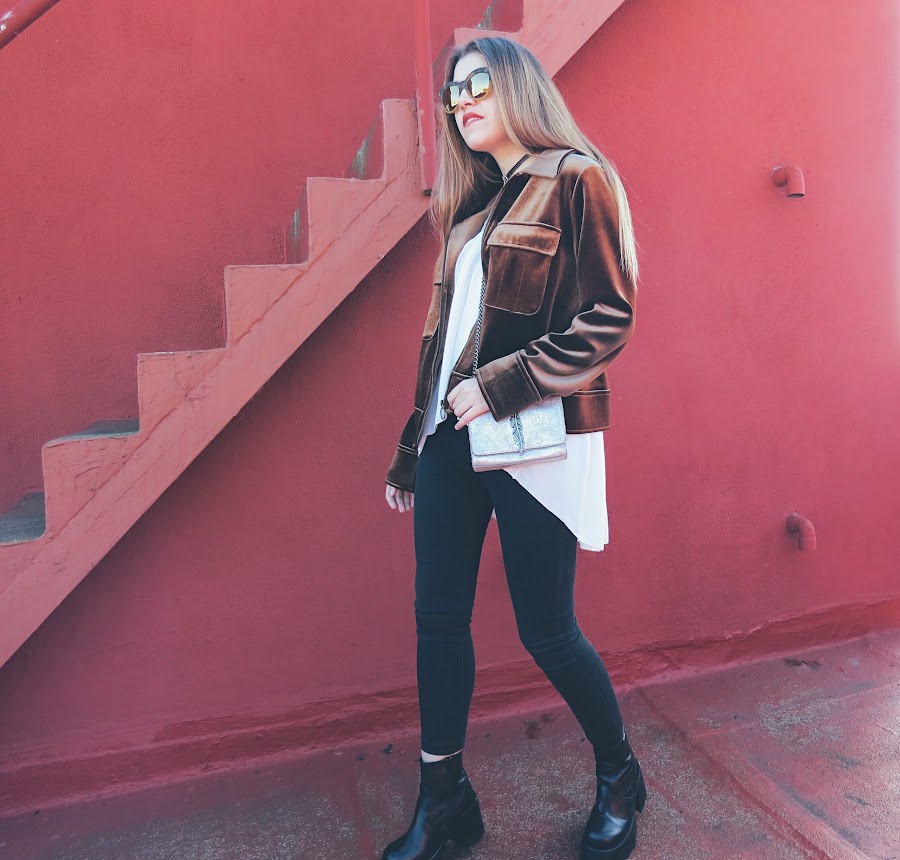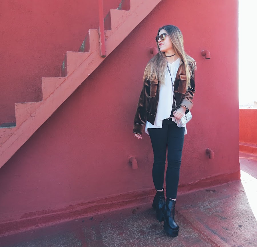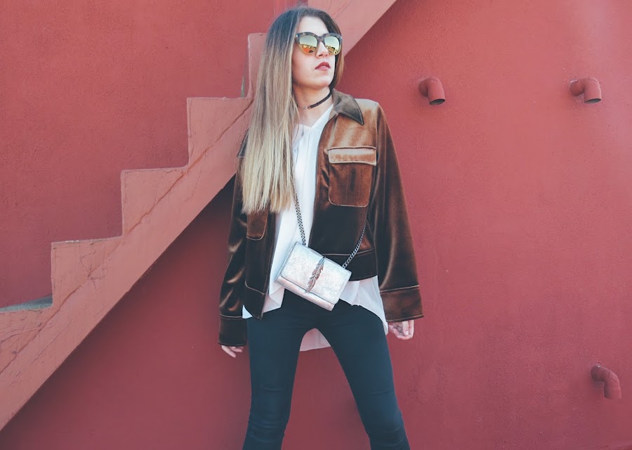 Hoy llevo una chaqueta de terciopelo y debajo una blusa blanca.